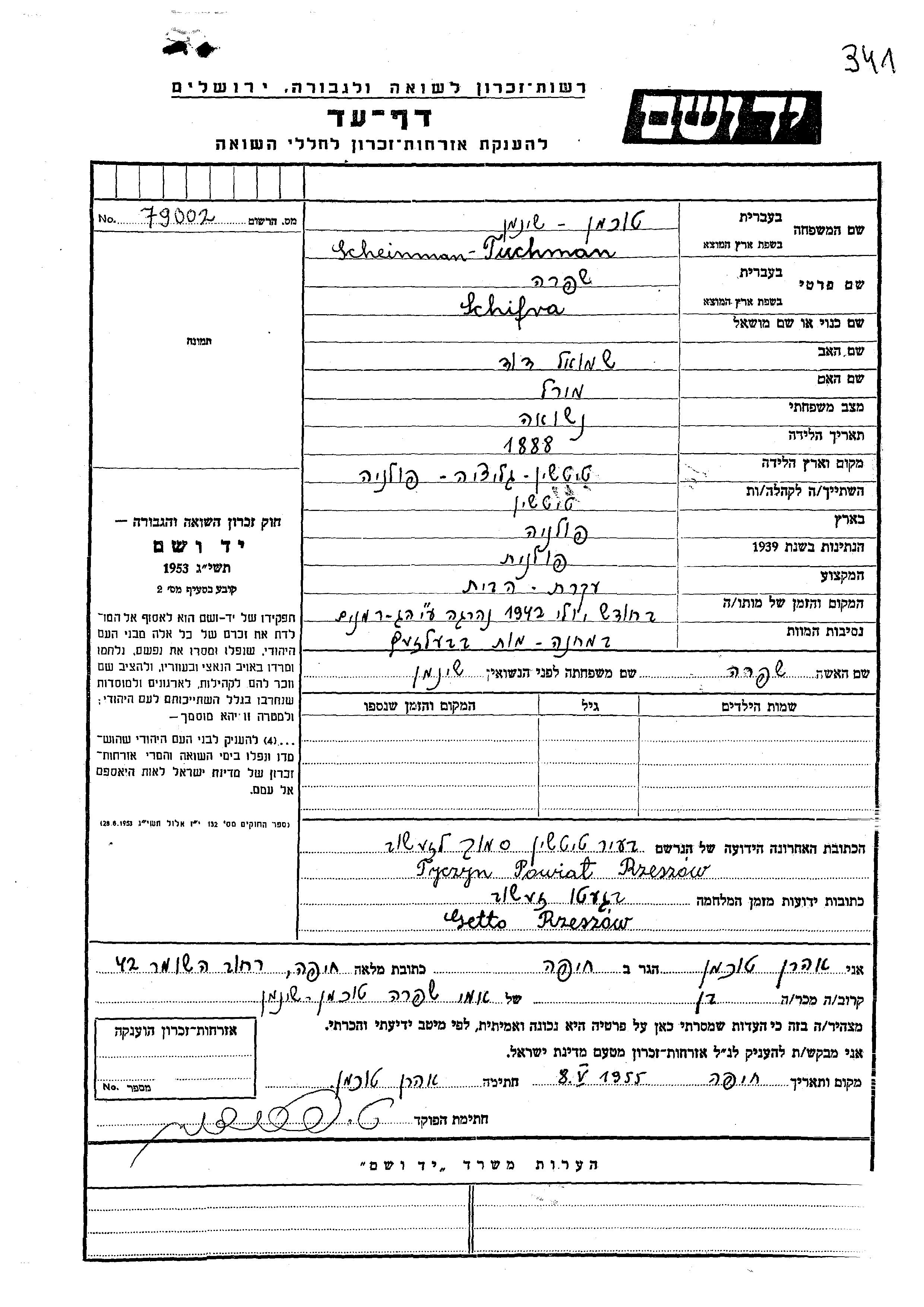 Schifra Tuchman, geb. Scheinman wurde im Jahr 1888 in Tyczyn, Polen geboren. Sie war die Tochter von Shmuel David und Morel. Sie war Hausfrau. Vor dem Zweiten Weltkrieg lebte sie in Tyczyn, Polen. Während des Krieges war sie in Rzeszow, Polen.