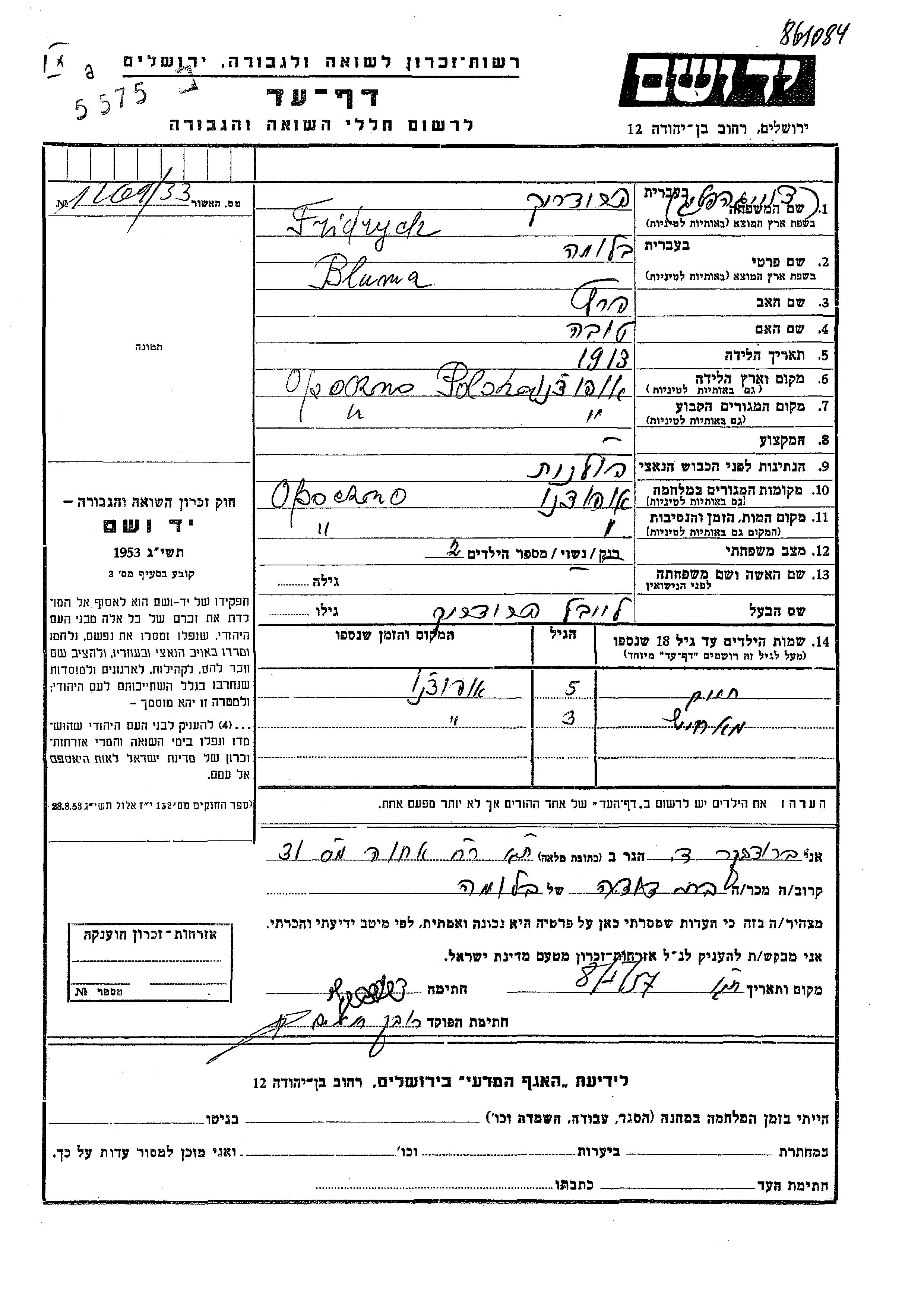Bluma Fridrych wurde im Jahr 1913 in Opoczno, Polen geboren. Sie war die Tochter von Hertz und Tova. Sie war mit Leibel Verheiratet. Vor dem Zweiten Weltkrieg lebte sie in Opoczno, Polen. Während des Krieges war sie in Opoczno, Polen.