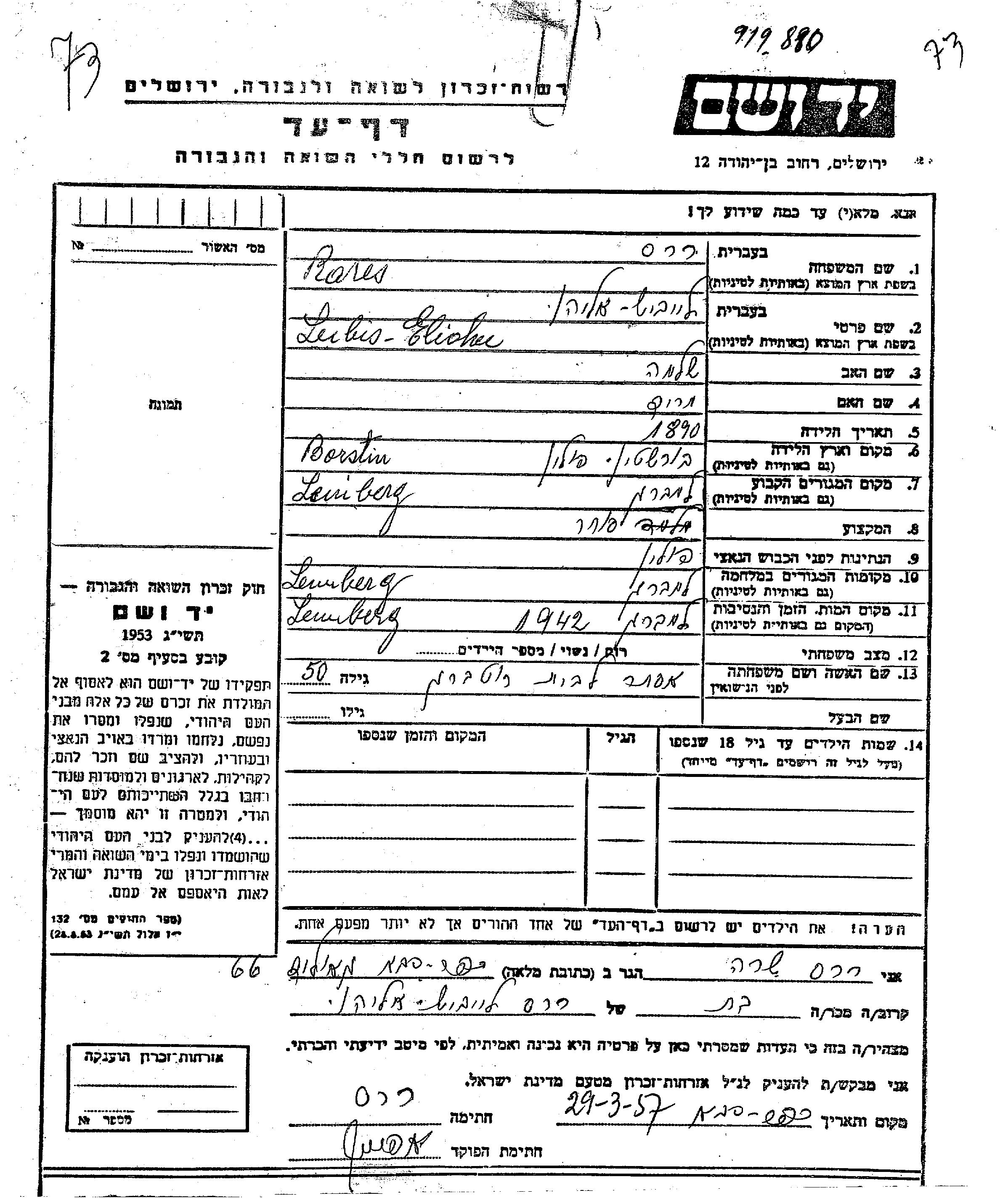 Leibis Eliahu Rares wurde im Jahr 1890 in Borstin, Polen geboren. Er war der Sohn von Shlomo und Miriam. Er war Kaufmann/-frau und mit Ester, geb. Rotberg Verheiratet. Vor dem Zweiten Weltkrieg lebte er in Lemberg, Polen. Während des Krieges war er in Lemberg, Polen.