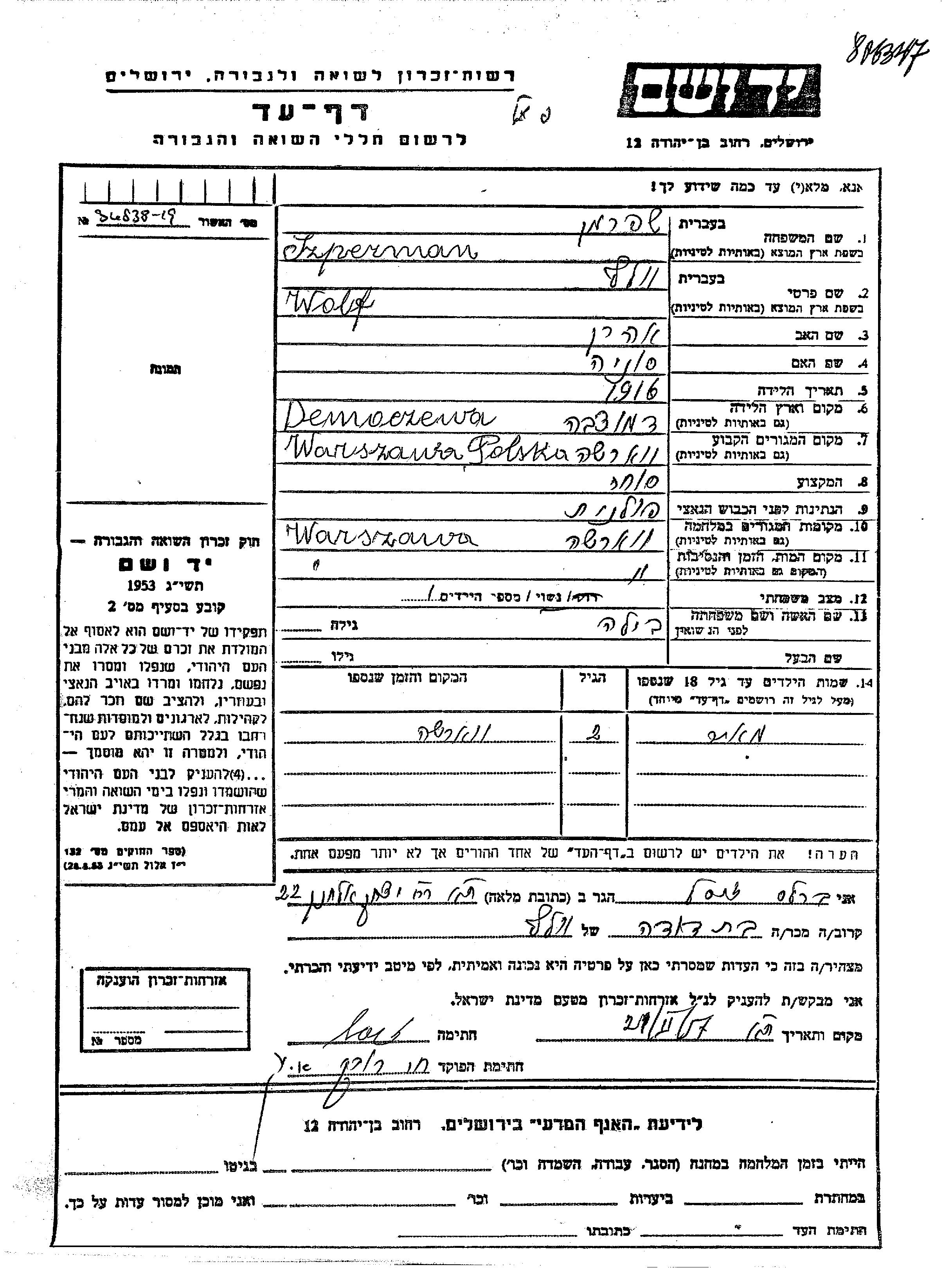 Wolf Szperman wurde im Jahr 1916 in Democzewa, Polen geboren. Er war der Sohn von Aharon und Sonia. Er war Kaufmann/-frau und mit Bila Verheiratet. Vor dem Zweiten Weltkrieg lebte er in Warsaw, Polen. Während des Krieges war er in Warsaw, Polen.