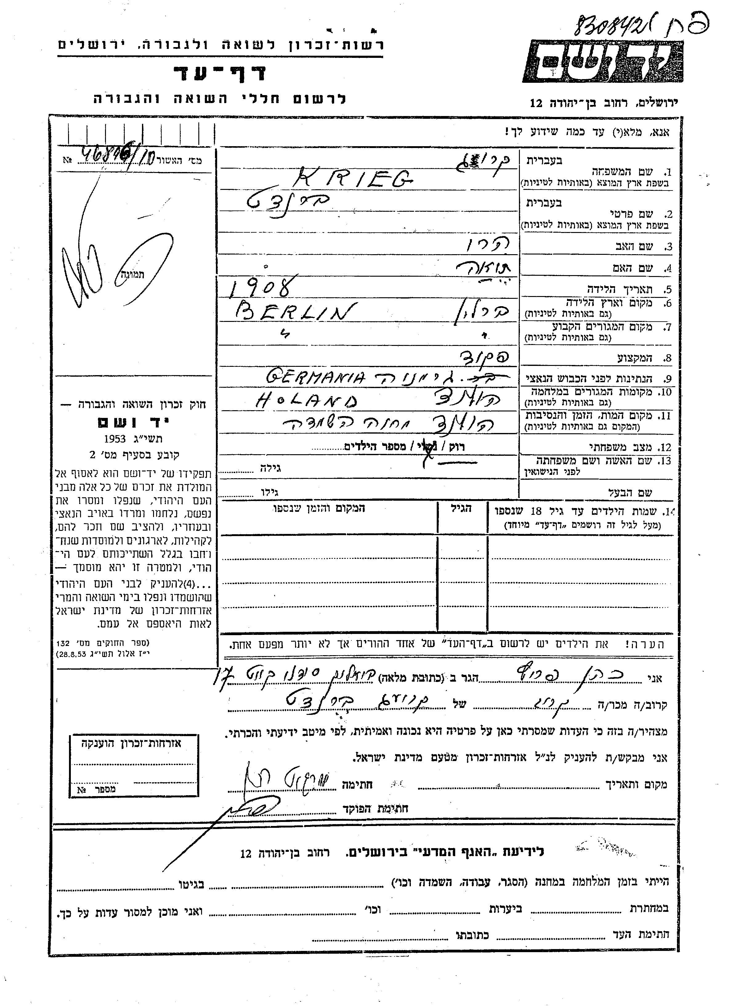 Bernadt Krieg wurde im Jahr 1908 in Berlin, Deutsches Reich geboren. Er war der Sohn von Hari und Tea. Er war Angestellte/-r und Ledig. Vor dem Zweiten Weltkrieg lebte er in Berlin, Deutsches Reich. Während des Krieges war er in Niederlande.