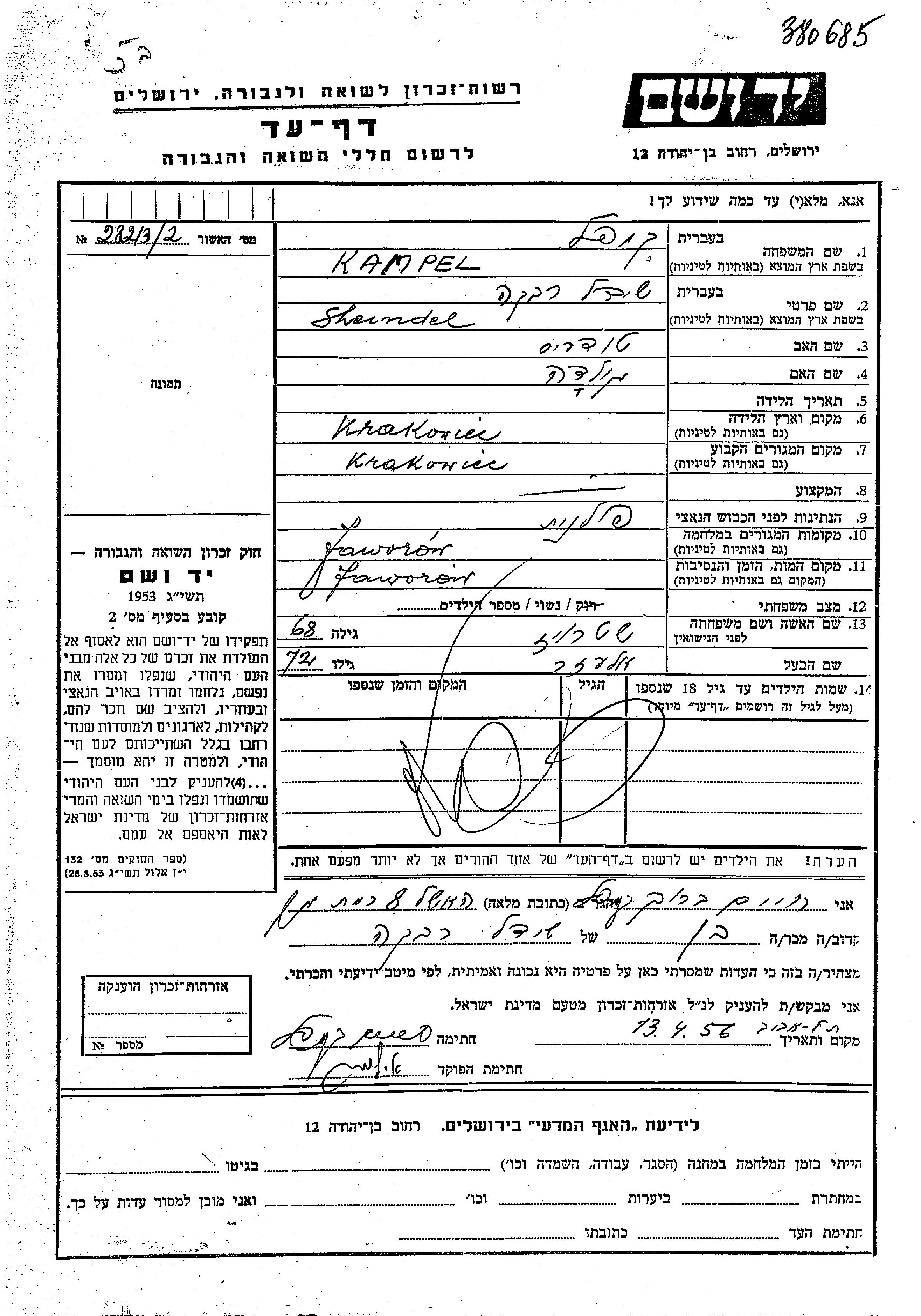 Sheindl Rivka Kampel, geb. Shtraus wurde in Krakowiec, Polen geboren. Sie war die Tochter von Todros und Golda. Sie war mit Elazar Verheiratet. Vor dem Zweiten Weltkrieg lebte sie in Krakowiec, Polen. Während des Krieges war sie in Jaworow, Polen.