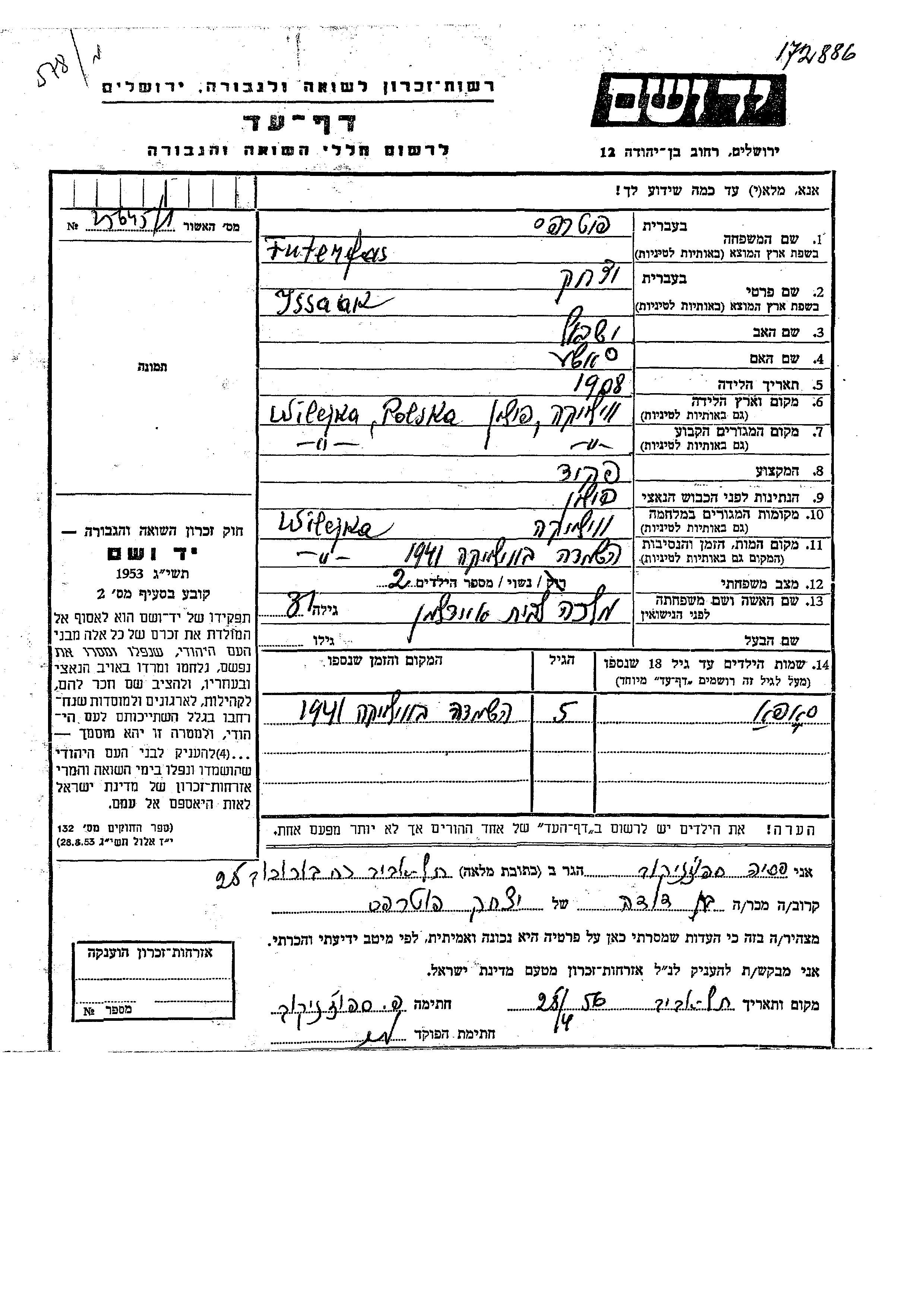 Issaak Futerfas wurde im Jahr 1908 in Wilejka, Polen geboren. Er war der Sohn von Yisrael und Soshe. Er war Angestellte/-r und mit Malka, geb. Eidelman Verheiratet. Vor dem Zweiten Weltkrieg lebte er in Wilejka, Polen. Während des Krieges war er in Wilejka, Polen.
