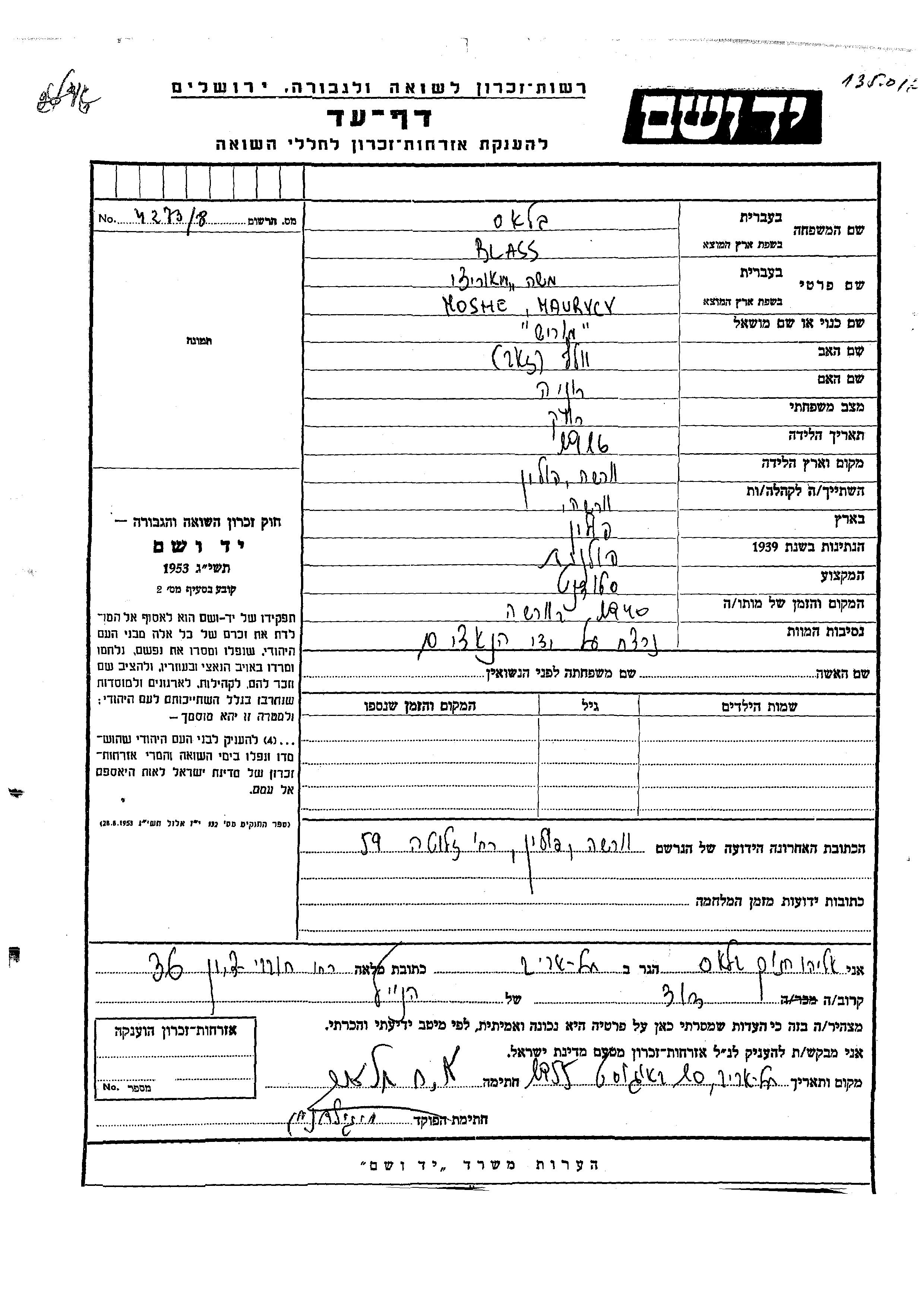 Maurycy Moshe Blass wurde im Jahr 1916 in Warsaw, Polen geboren. Er war der Sohn von Volf und Ronia. Er war Student. Vor dem Zweiten Weltkrieg lebte er in Warsaw, Polen.