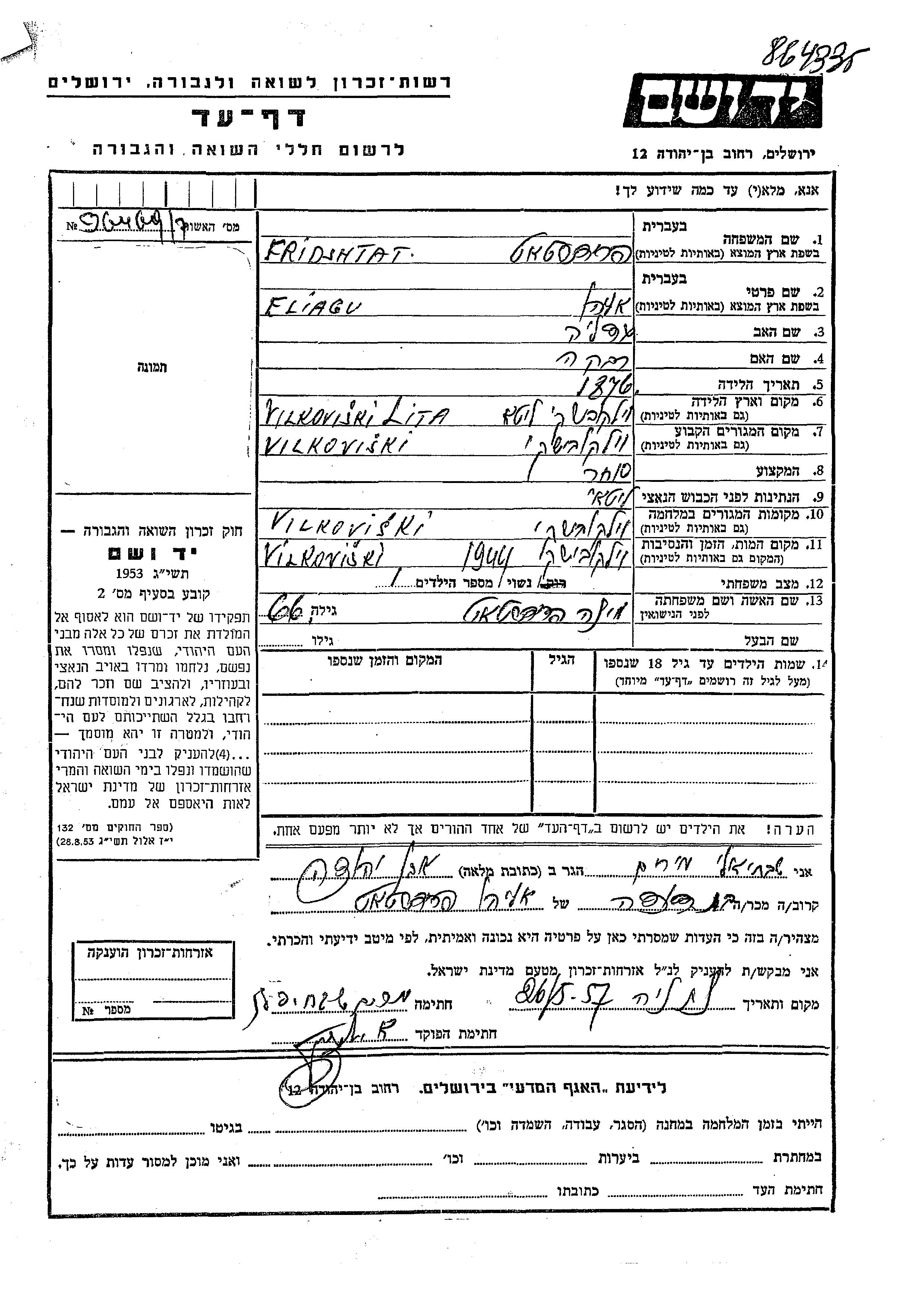 Eliagu wurde in der Schoah ermordet. Todesort: Vilkovishki, Litauen im Jahr 1944.