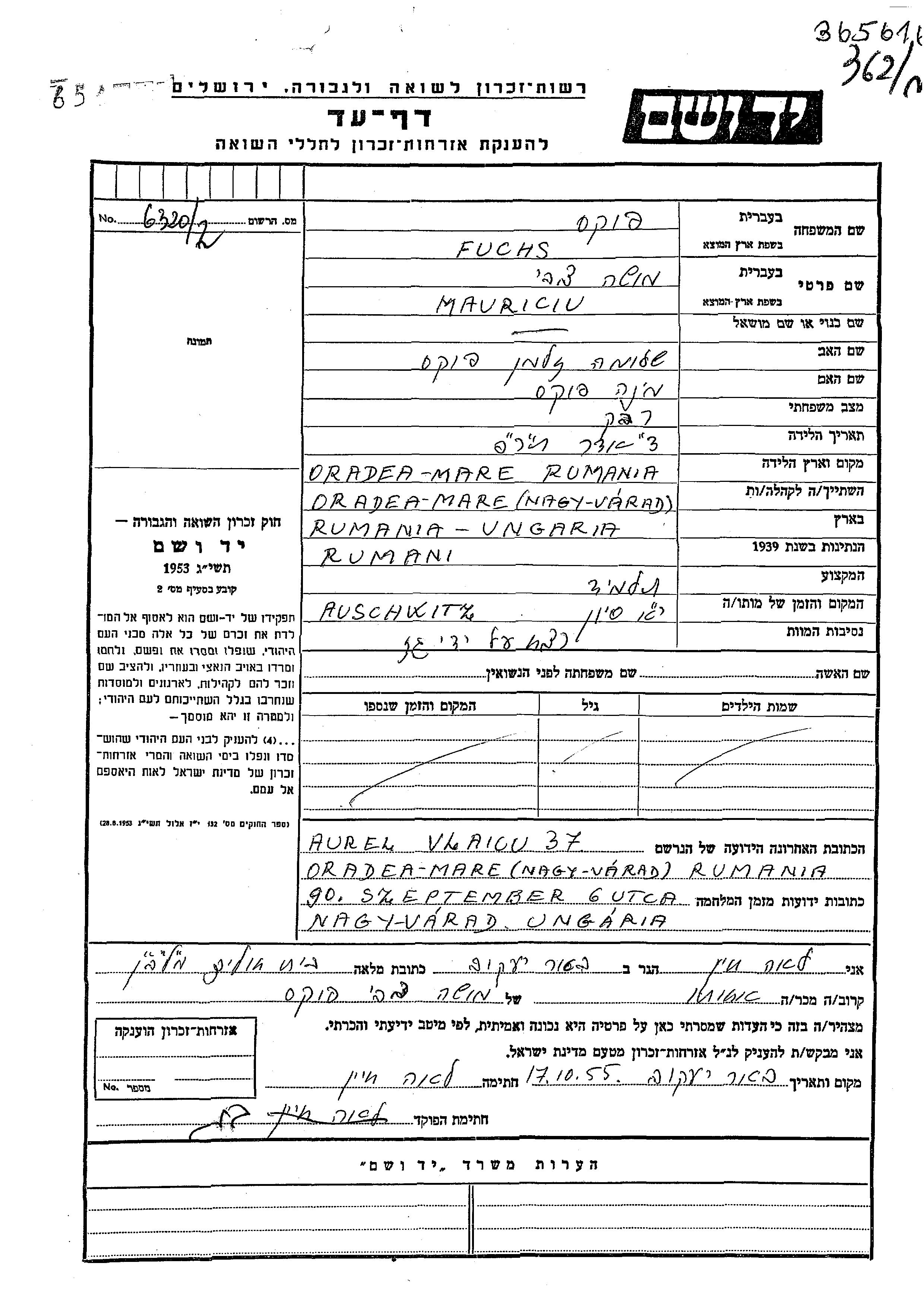 Mauriciu Moshe Tzvi Fuchs wurde im Jahr 1920 in Oradea Mare, Rumänien geboren. Er war der Sohn von Shlomo Zalman und Mina. Er war Schüler/-in und Ledig. Vor dem Zweiten Weltkrieg lebte er in Oradea Mare, Rumänien. Während des Krieges war er in Oradea Mare, Rumänien.