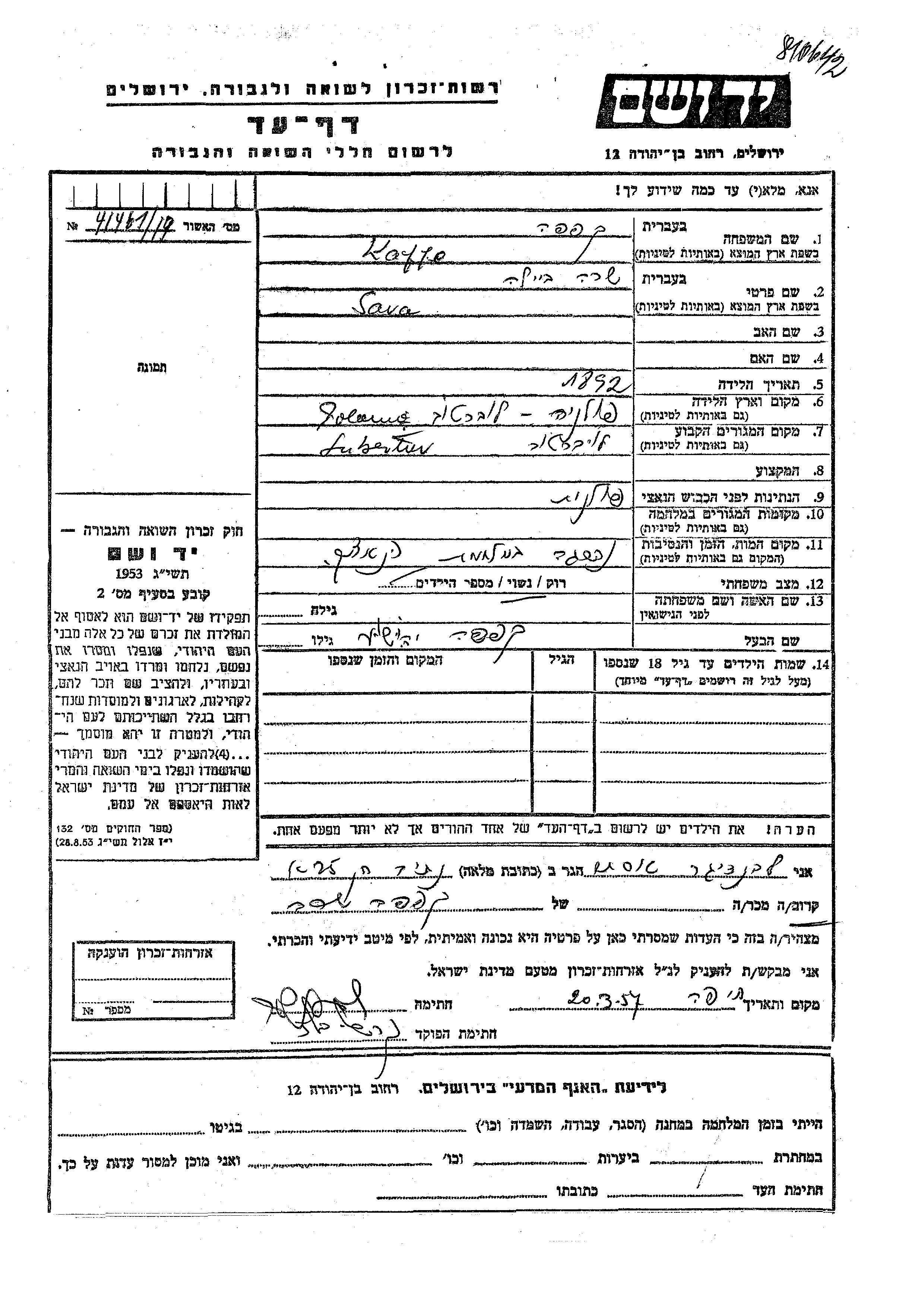 Sara Beila Kaffe wurde im Jahr 1892 in Lubartow, Polen geboren. Sie war mit Yehoshua Verheiratet. Vor dem Zweiten Weltkrieg lebte sie in Lubartow, Polen.