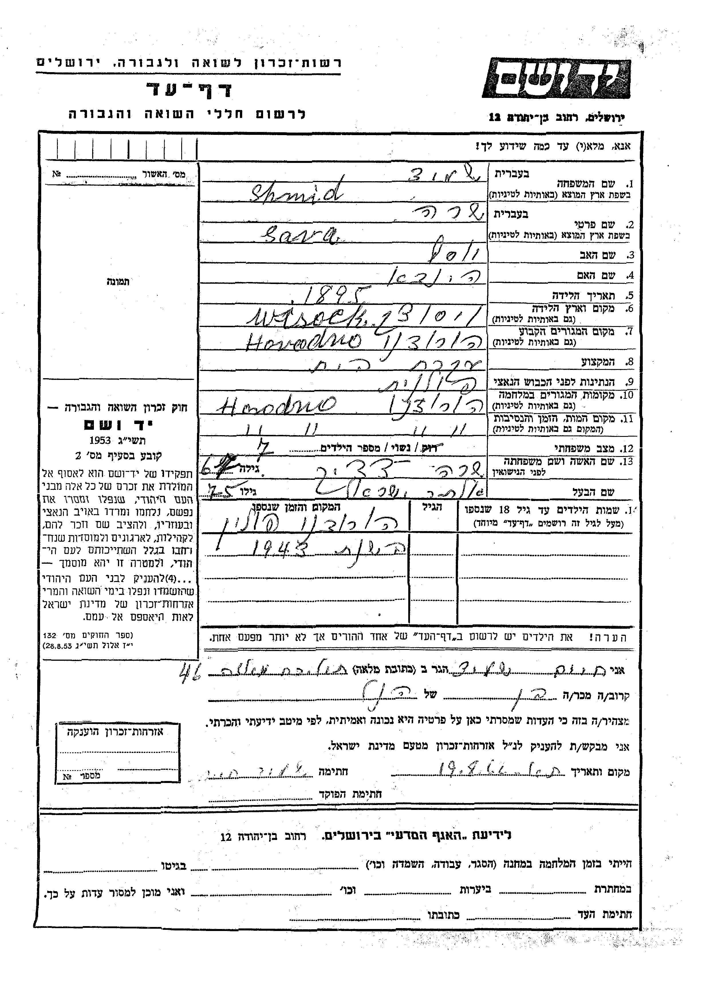 Sara Shmid, geb. Chechik wurde im Jahr 1895 in Wysokie Mazowieckie, Polen geboren. Sie war die Tochter von Yosef und Hinda. Sie war Hausfrau und mit Alter Yisrael Verheiratet. Vor dem Zweiten Weltkrieg lebte sie in Horodno, Polen. Während des Krieges war sie in Horodno, Polen.