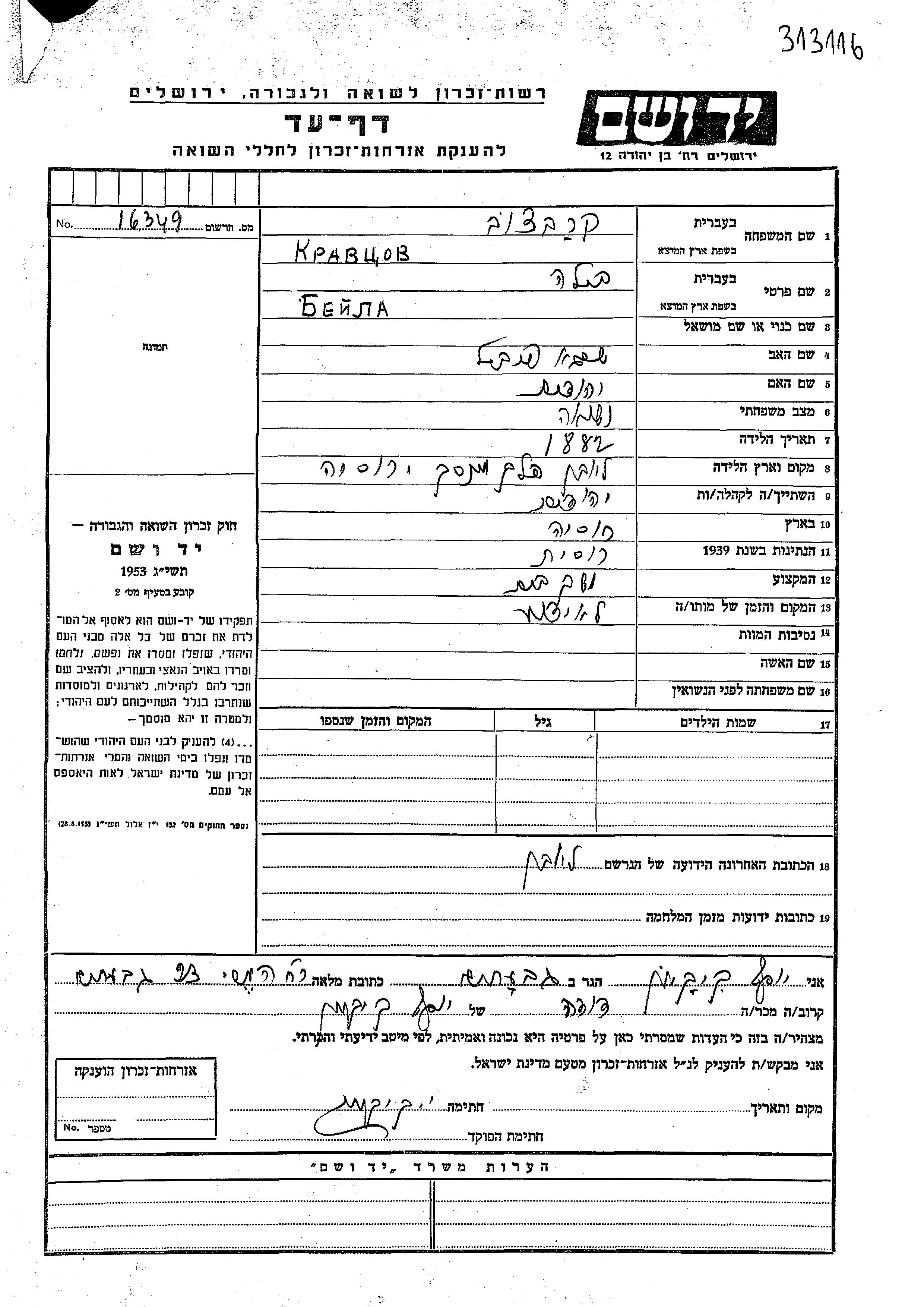 Beila Krawcow wurde im Jahr 1882 in Lyuban, Weißrussland (UdSSR) geboren. Sie war die Tochter von Shraga Feibush und Yehudit. Sie war Haushaltshilfe und Verheiratet. Vor dem Zweiten Weltkrieg lebte sie in Lyuban, Weißrussland (UdSSR).