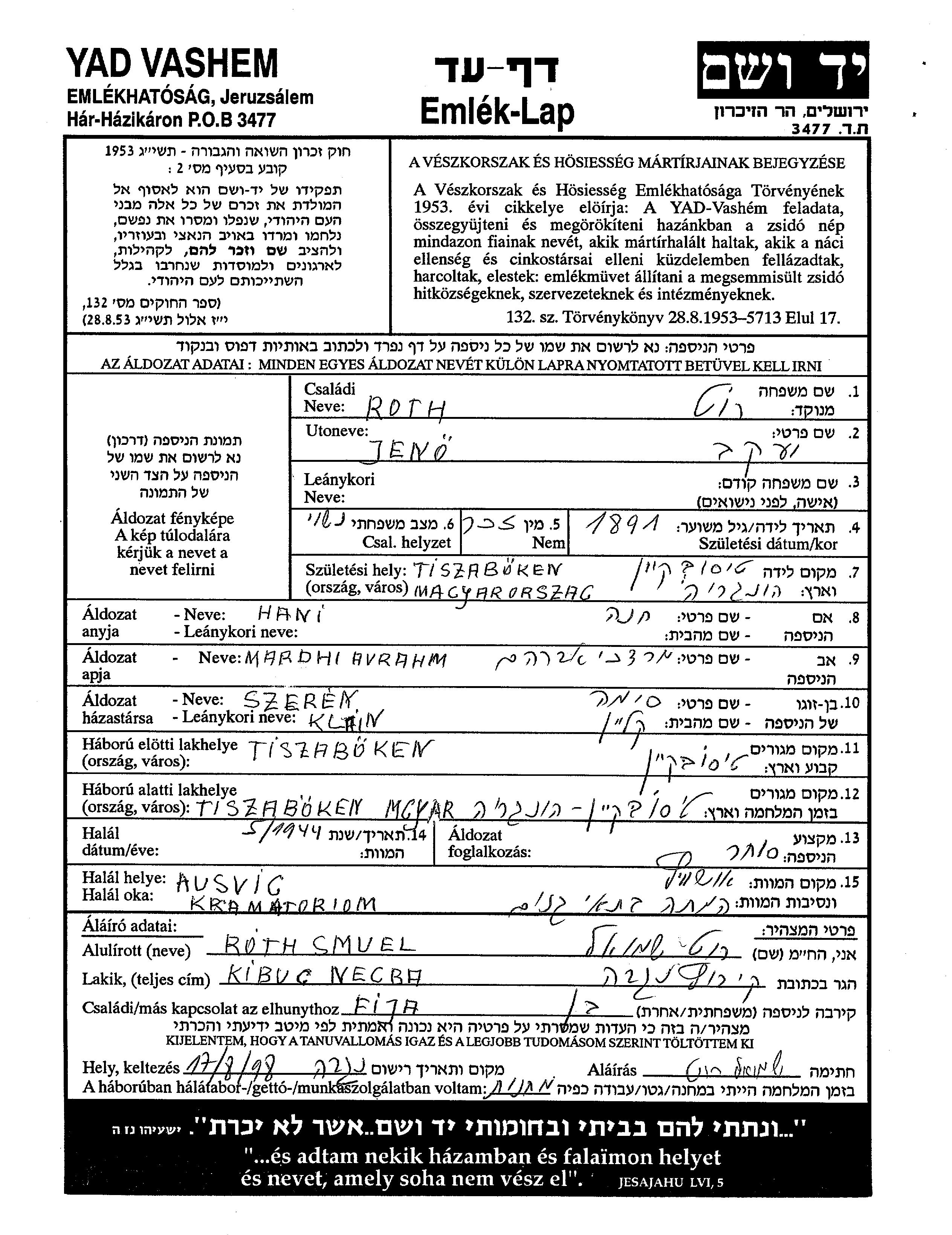 Roth Rut Jeno Yaakov 1891 Tiszabokeny, Tschechoslowakei Gedenkblatt