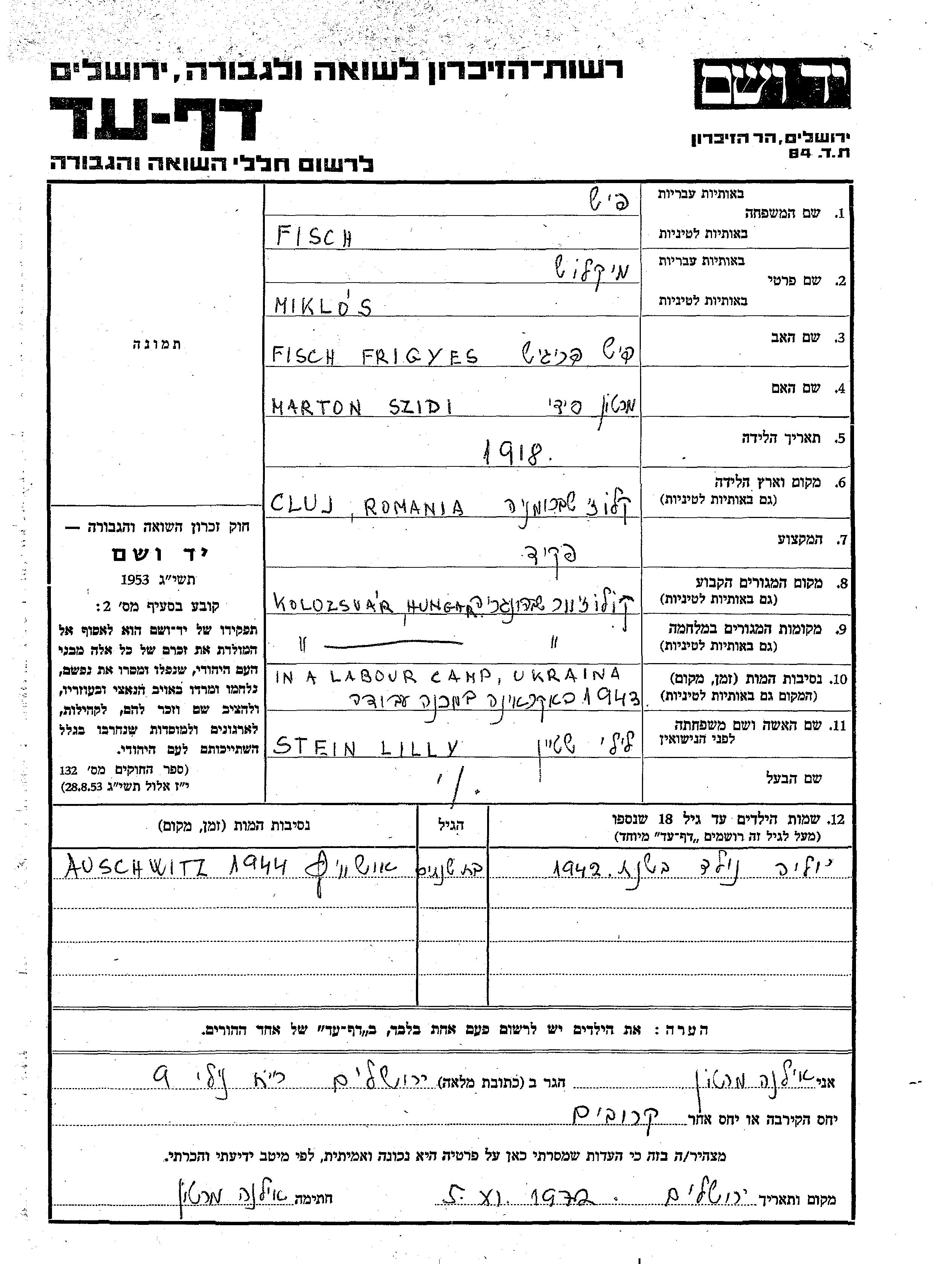 Miklos Fisch wurde im Jahr 1918 in Cluj, Rumänien geboren. Er war der Sohn von Frigyes und Szidi. Er war Angestellte/-r. Vor dem Zweiten Weltkrieg lebte er in Koloszvar, Rumänien. Während des Krieges war er in Koloszvar, Rumänien.