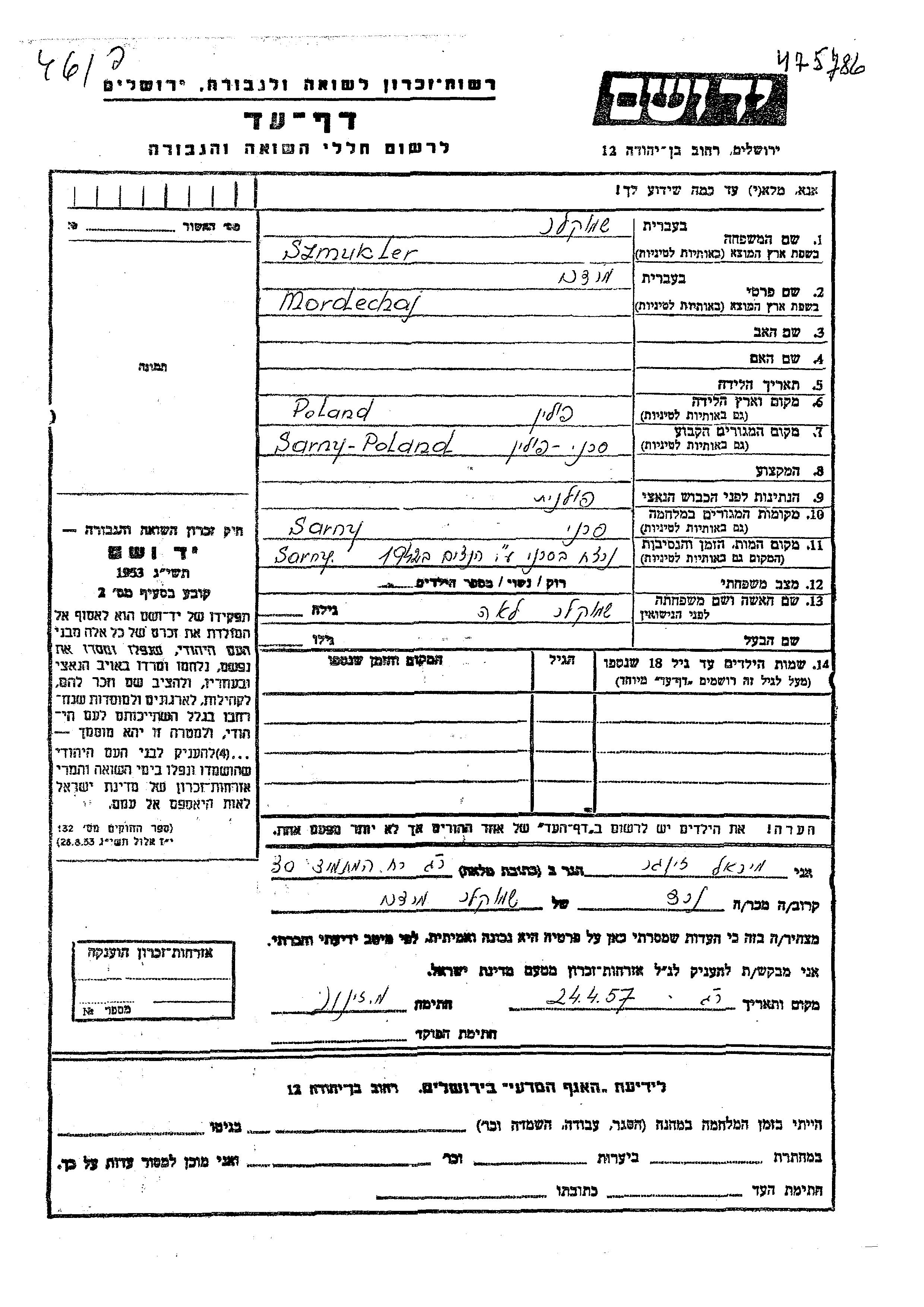 Mordechj Szmukler wurde in Polen geboren. Er war mit Lea Verheiratet. Vor dem Zweiten Weltkrieg lebte er in Sarny, Polen. Während des Krieges war er in Sarny.