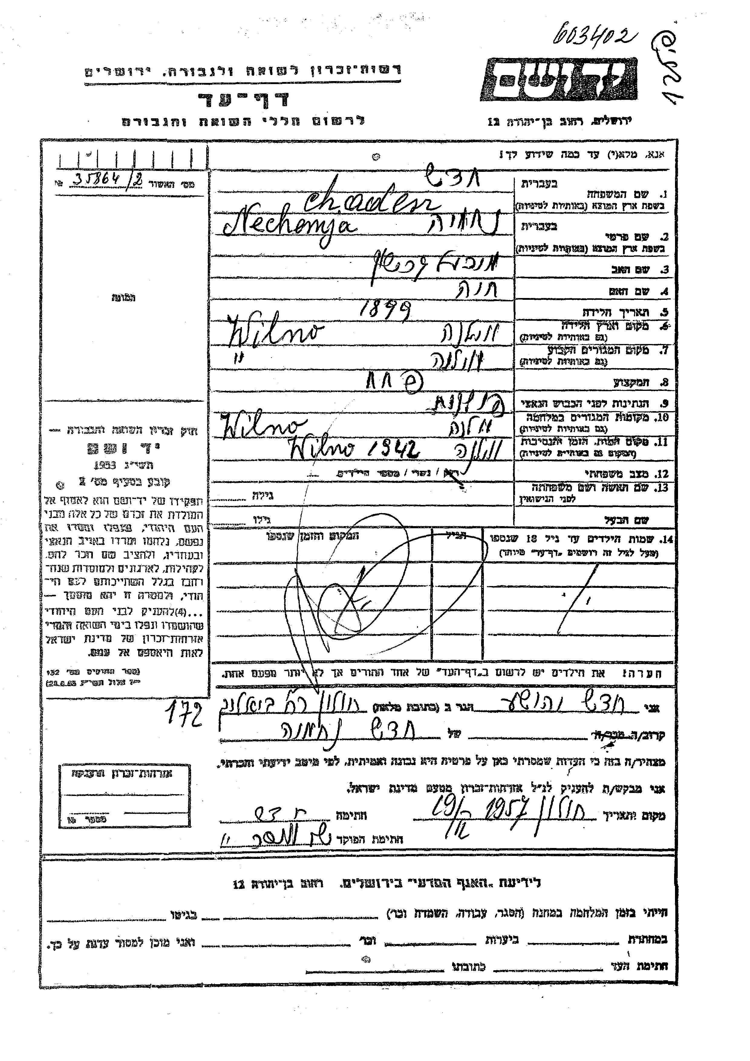 Nechemja wurde in der Schoah ermordet. Todesort: Wilno, Polen im Jahr 1942.