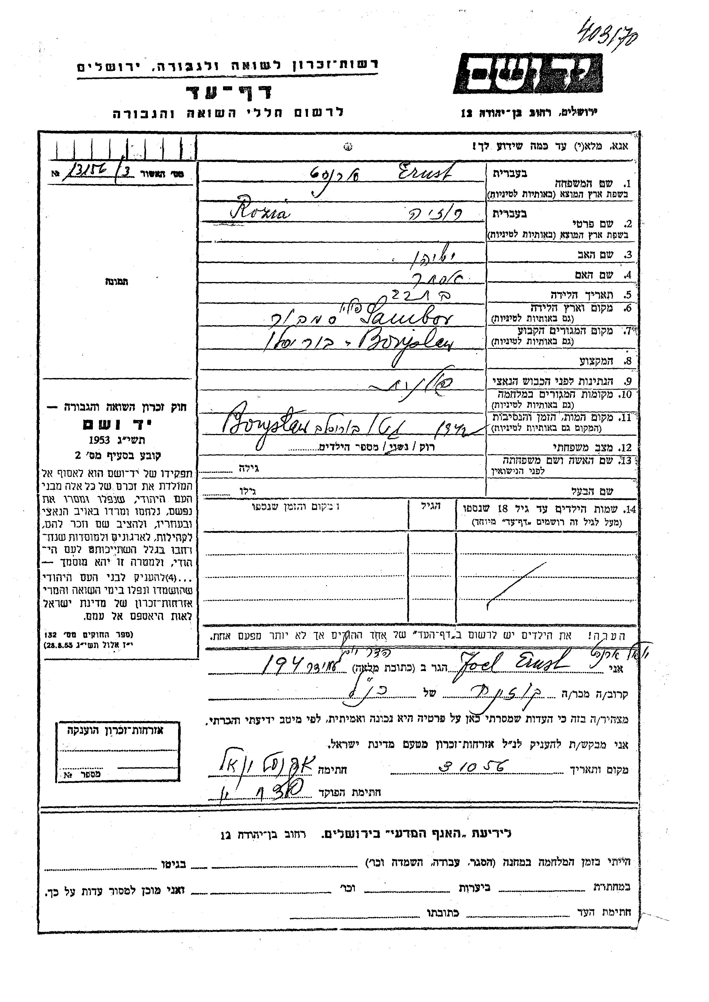 Rozia Ernst wurde in Sambor, Polen geboren. Sie war die Tochter von Ieshaiahu und Ester. Sie war Ledig. Vor dem Zweiten Weltkrieg lebte sie in Boryslaw, Polen.