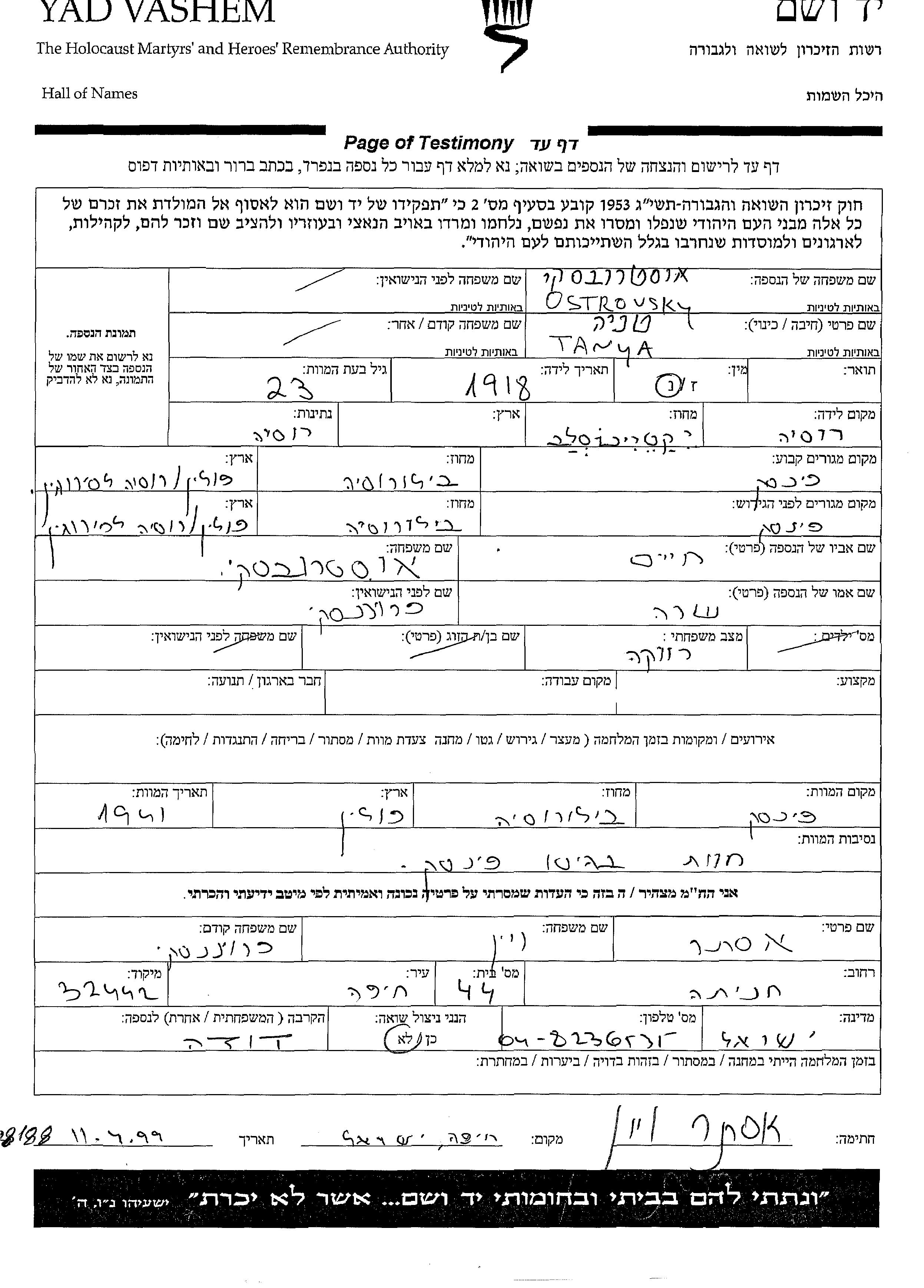 Tanya Ostrovsky wurde im Jahr 1918 in Yekaterinoslav, Ukraine (UdSSR) geboren. Sie war die Tochter von Khaim und Sara. Sie war Ledig. Vor dem Zweiten Weltkrieg lebte sie in Pinsk, Polen. Während des Krieges war sie in Pinsk, Polen.