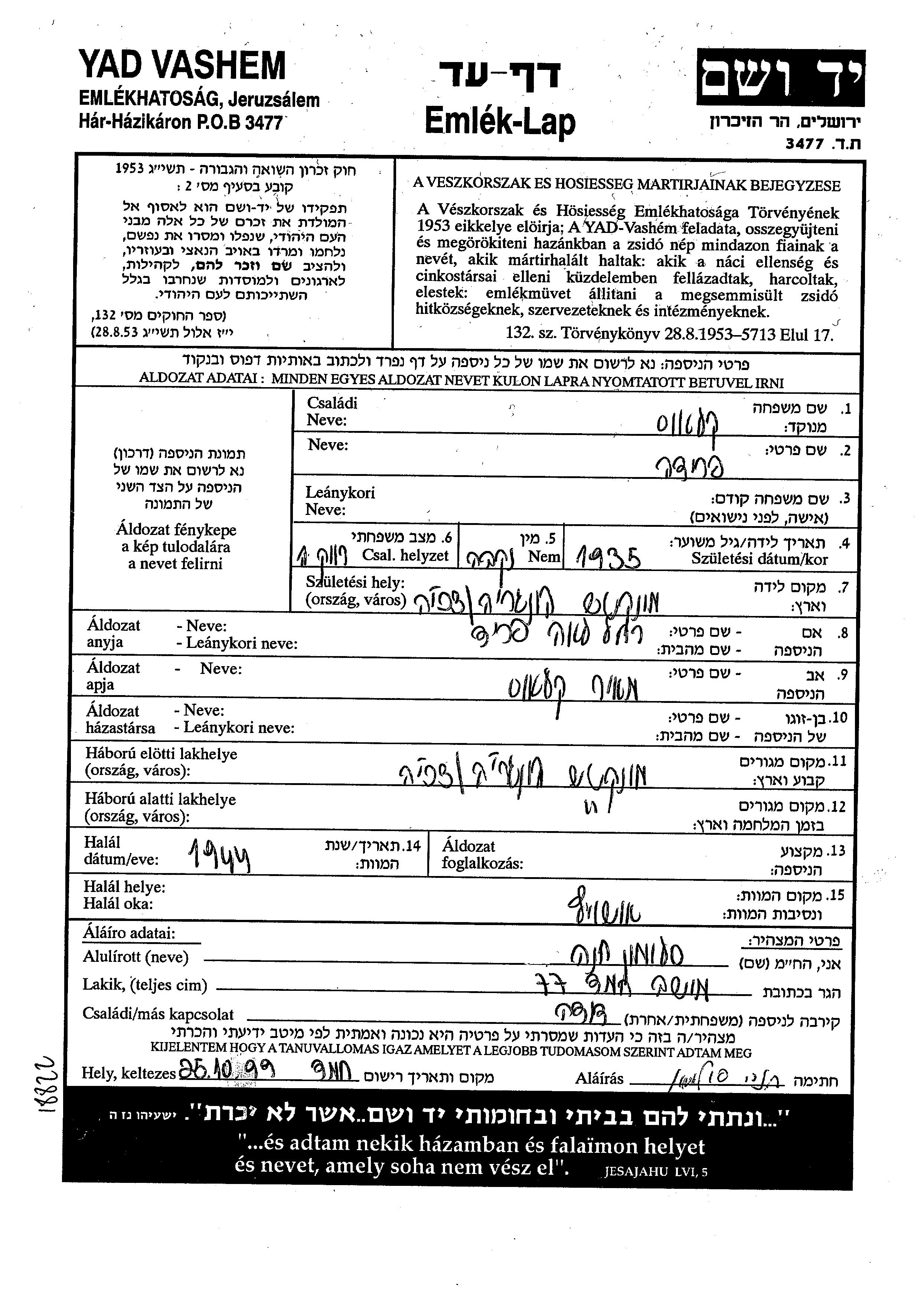 Frida Laiosh wurde im Jahr 1935 in Mukacevo, Tschechoslowakei geboren. Sie war die Tochter von Meir und Rakhel Lea. Sie war Ledig. Vor dem Zweiten Weltkrieg lebte sie in Mukacevo, Tschechoslowakei. Während des Krieges war sie in Mukacevo, Tschechoslowakei.