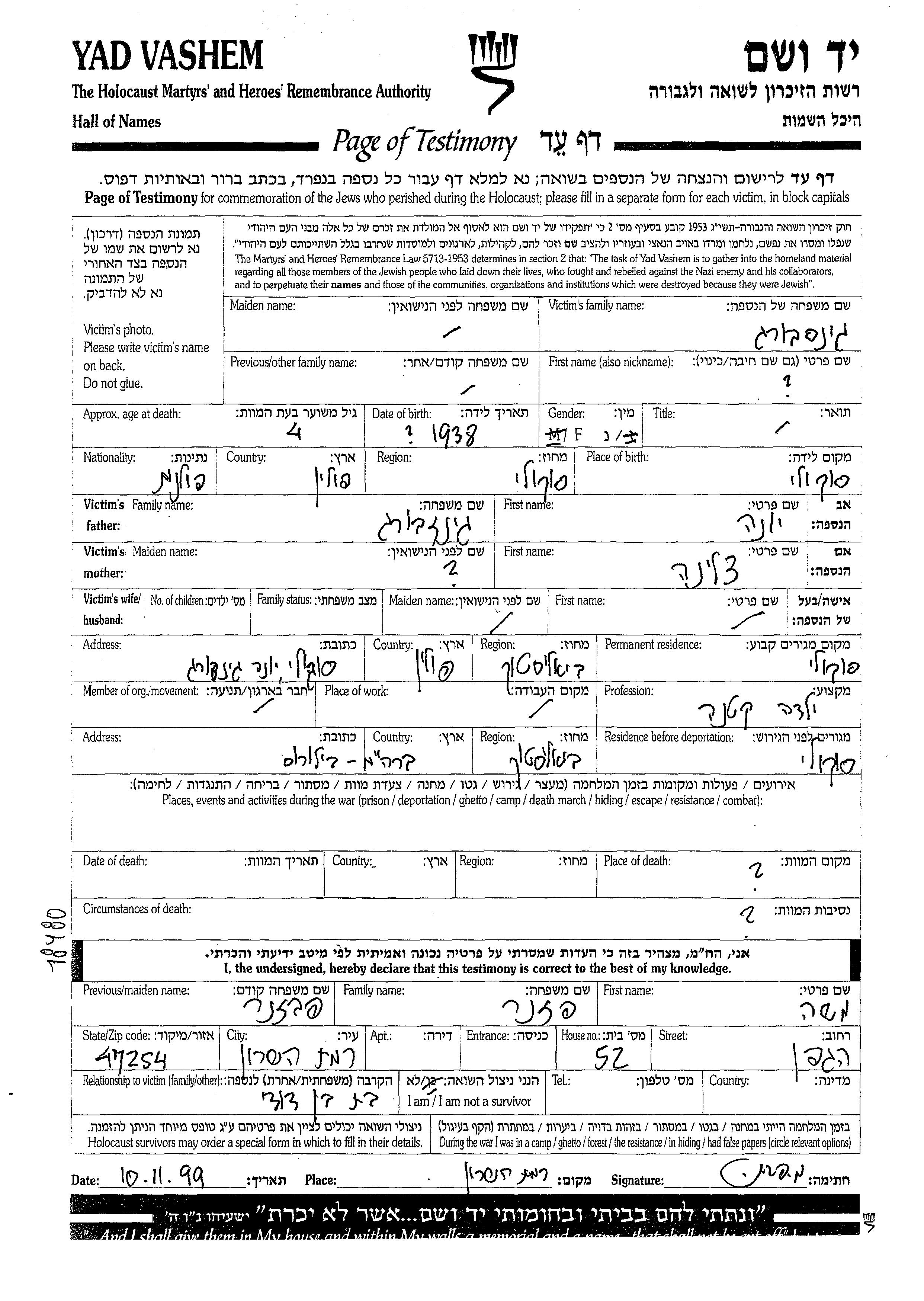 Vorname unbekannt Ginzburg wurde im Jahr 1938 in Sokoli, Polen geboren. Er war der Sohn von Yona und Tzelina. Er war Kind. Vor dem Zweiten Weltkrieg lebte er in Sokoli, Polen. Während des Krieges war er in Sokoli, Polen.