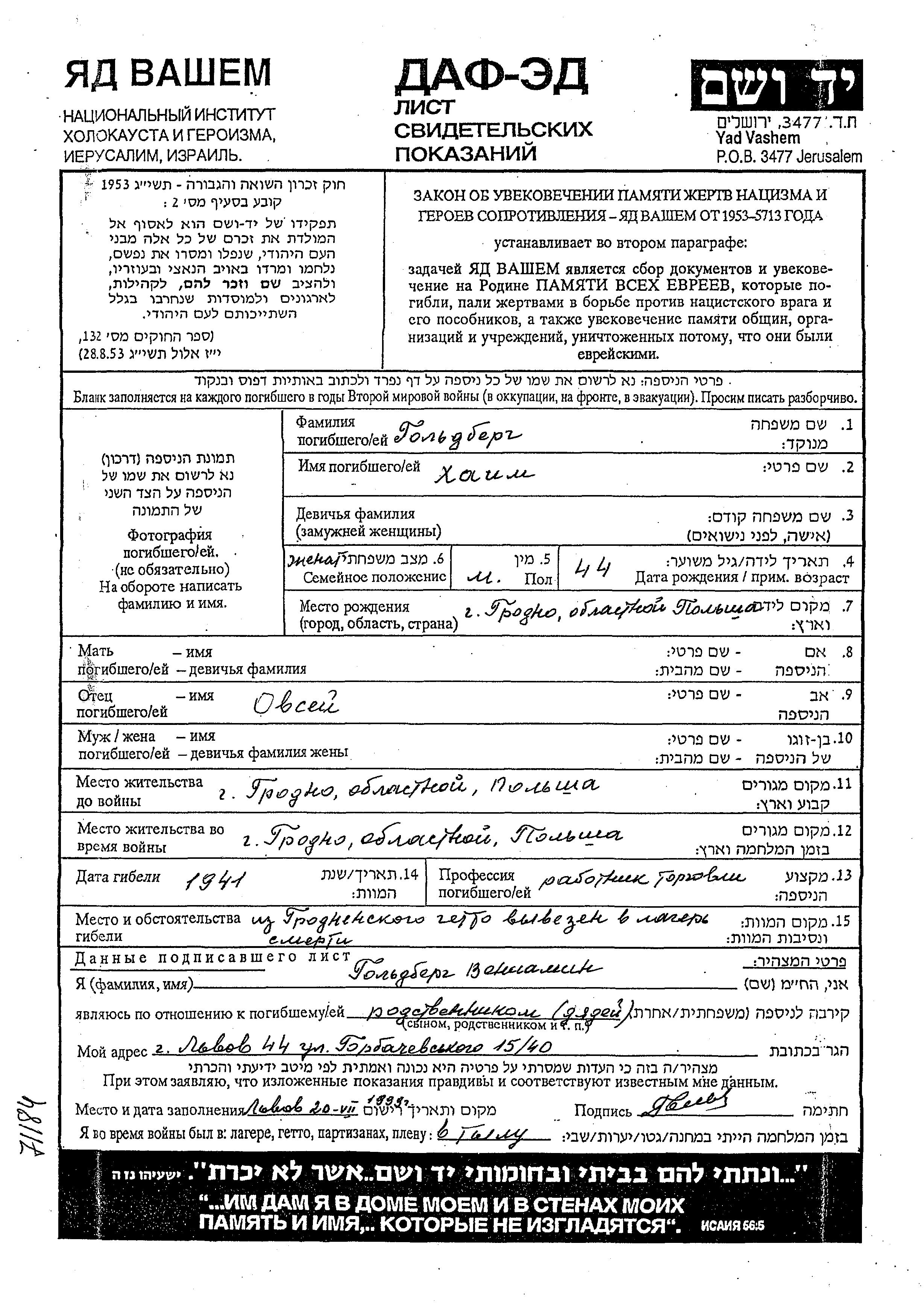 Khaim Goldberg wurde in Grodno, Polen geboren. Er war der Sohn von Ovsey. Er war Handelsangestellter und Verheiratet. Vor dem Zweiten Weltkrieg lebte er in Grodno, Polen. Während des Krieges war er in Grodno, Polen.