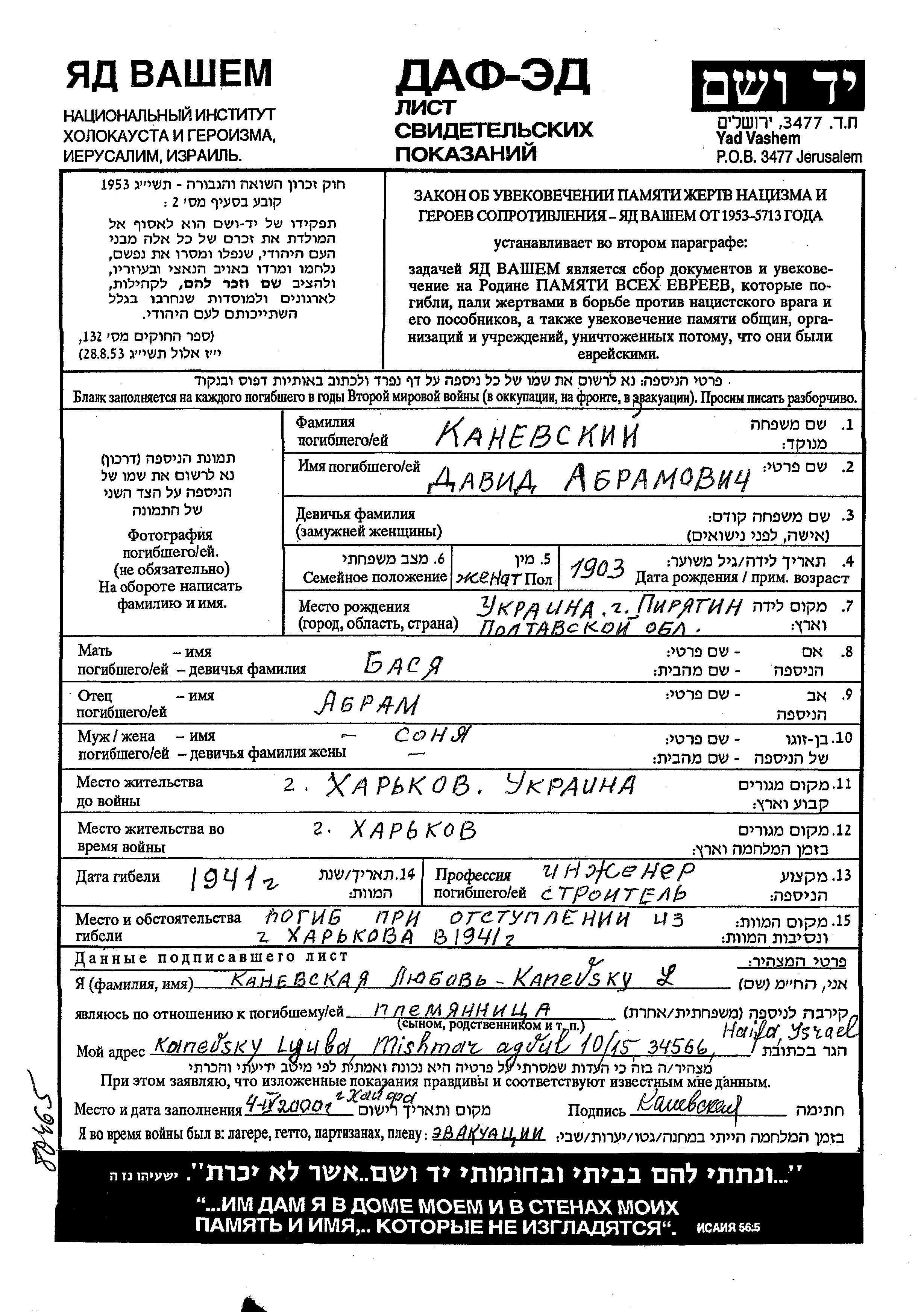 Kanevski David 1903 Kharkov, Ukraine (UdSSR) Gedenkblatt