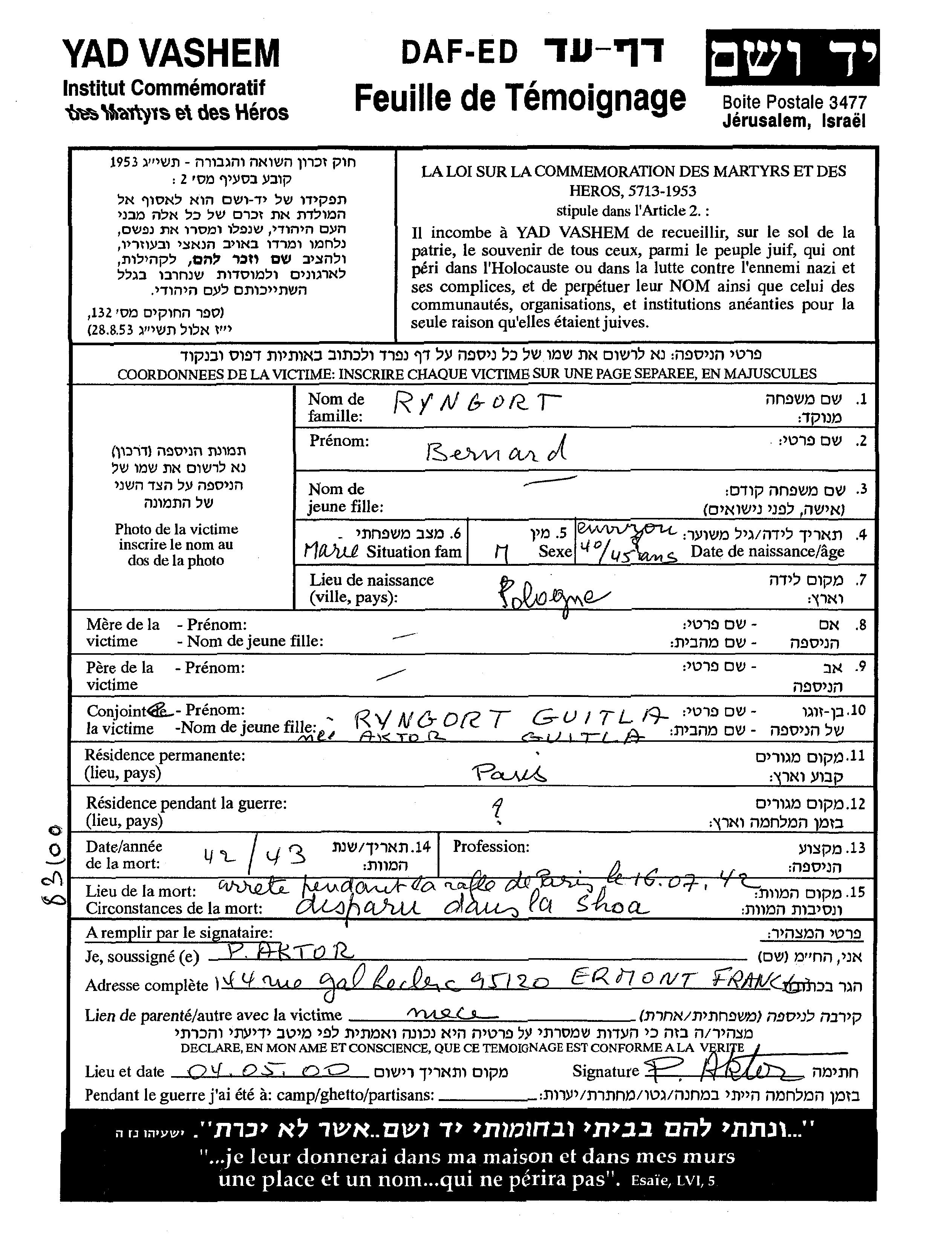 Bernard Ryngort wurde in Polen geboren. Er war mit Guitla Verheiratet. Vor dem Zweiten Weltkrieg lebte er in Paris, Frankreich.