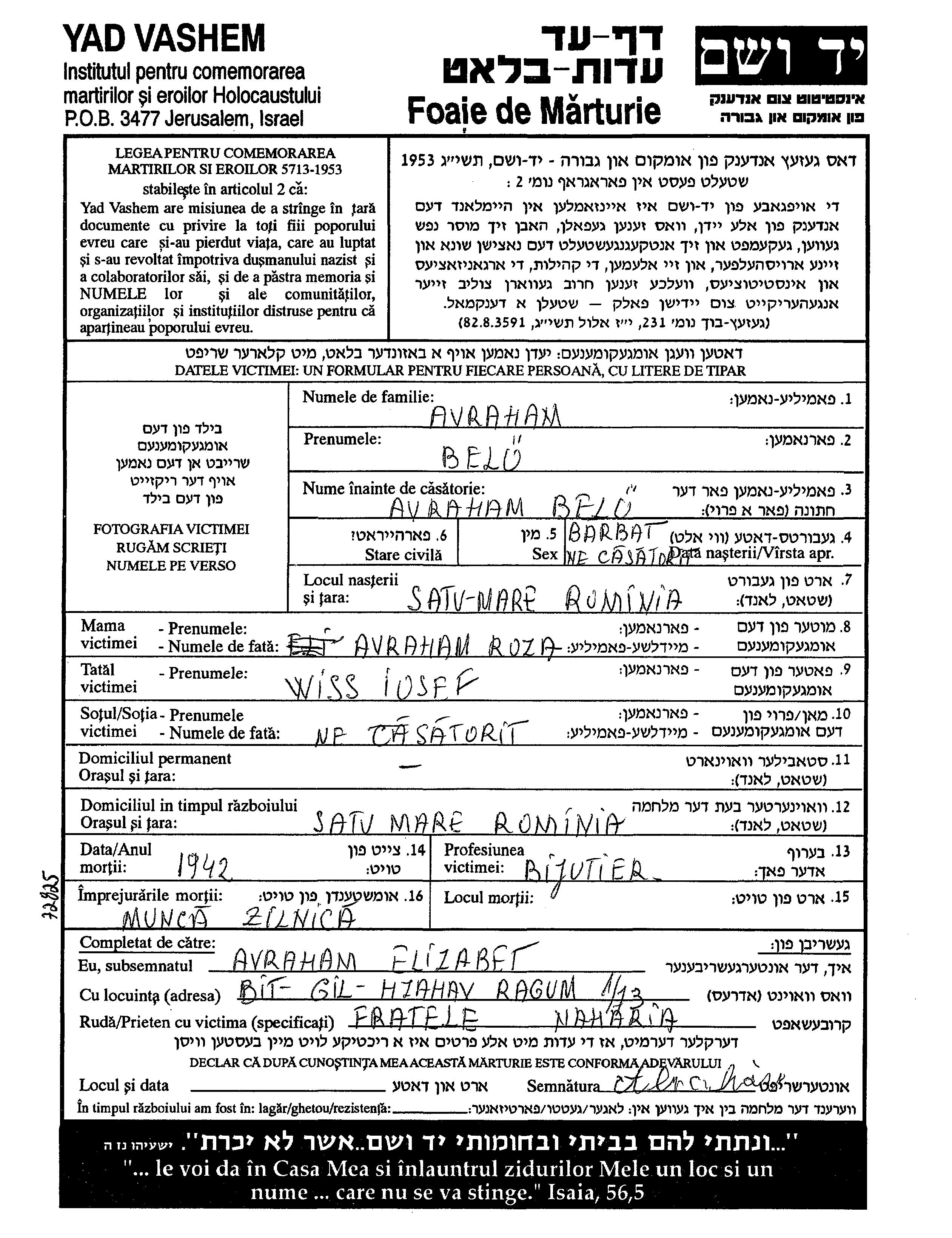 Belo Avraham Wiss wurde in Satu Mare, Rumänien geboren. Er war der Sohn von Yosef und Roza. Er war Bijutier und Ledig. Während des Krieges war er in Satu Mare, Rumänien.