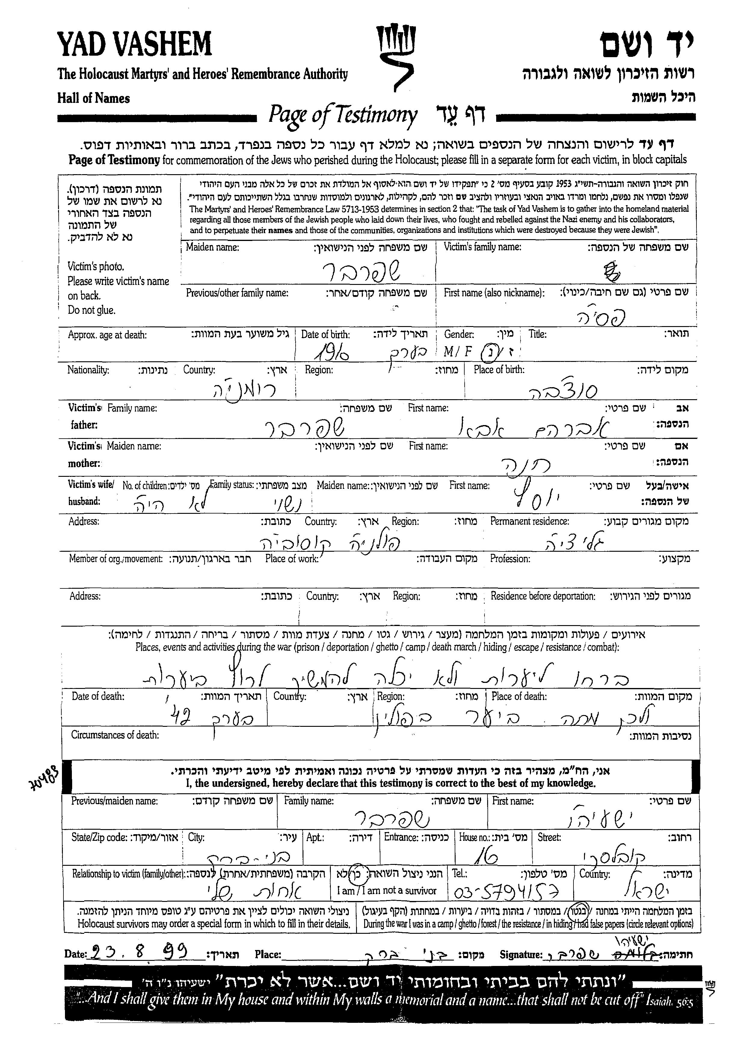 Pesia Name unbekannt, geb. Shperber wurde im Jahr 1910 in Socawo, Rumänien geboren. Sie war die Tochter von Avraham Aba und Khana. Sie war mit Yosef Verheiratet. Vor dem Zweiten Weltkrieg lebte sie in Kosow, Polen.