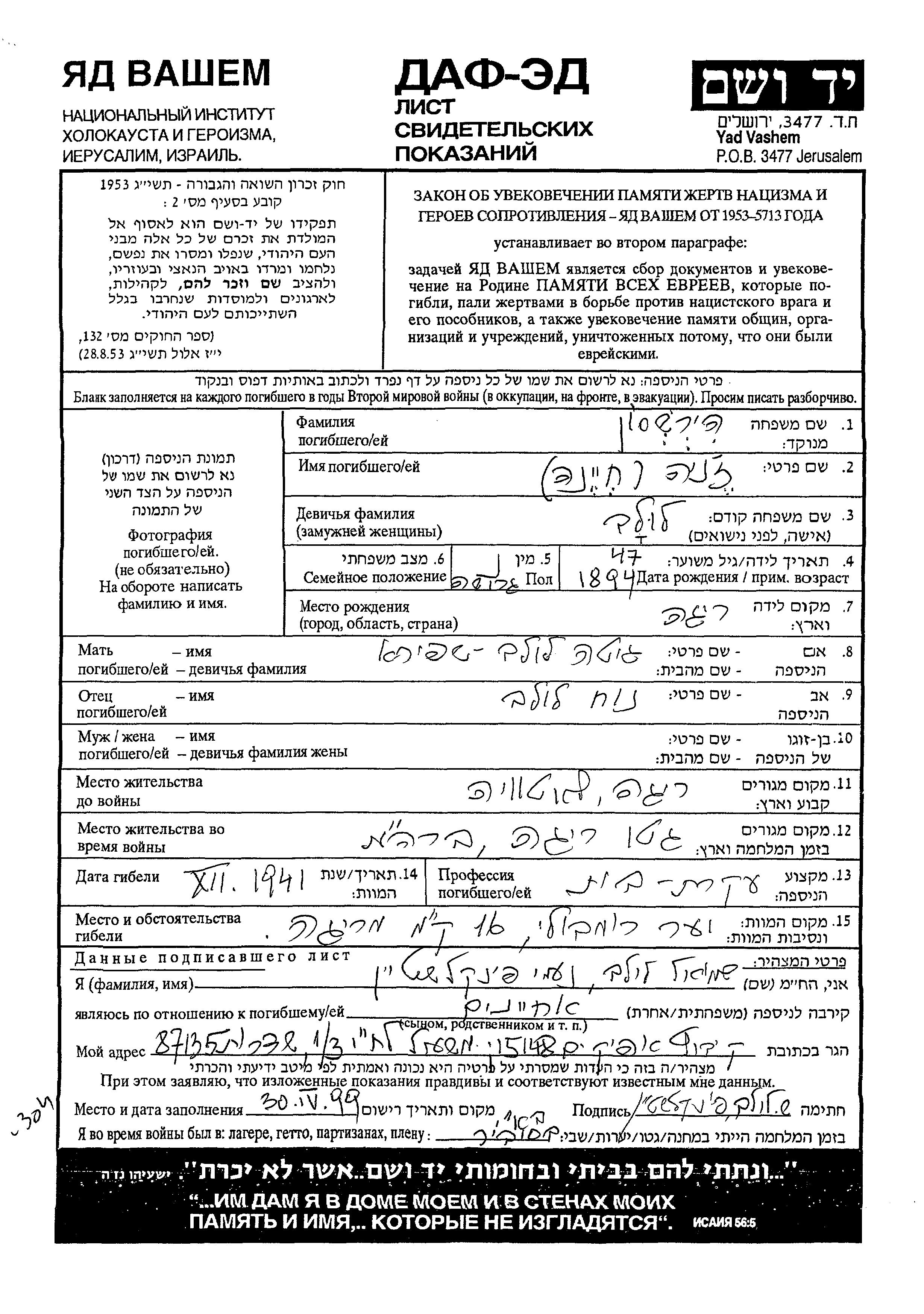 Zhenia Khiena Hirshson, geb. Lulev wurde im Jahr 1894 in Riga, Lettland geboren. Sie war die Tochter von Noakh und Gita, geb. Shapira. Sie war Hausfrau und Geschieden. Vor dem Zweiten Weltkrieg lebte sie in Riga, Lettland. Während des Krieges war sie in Riga, Lettland.