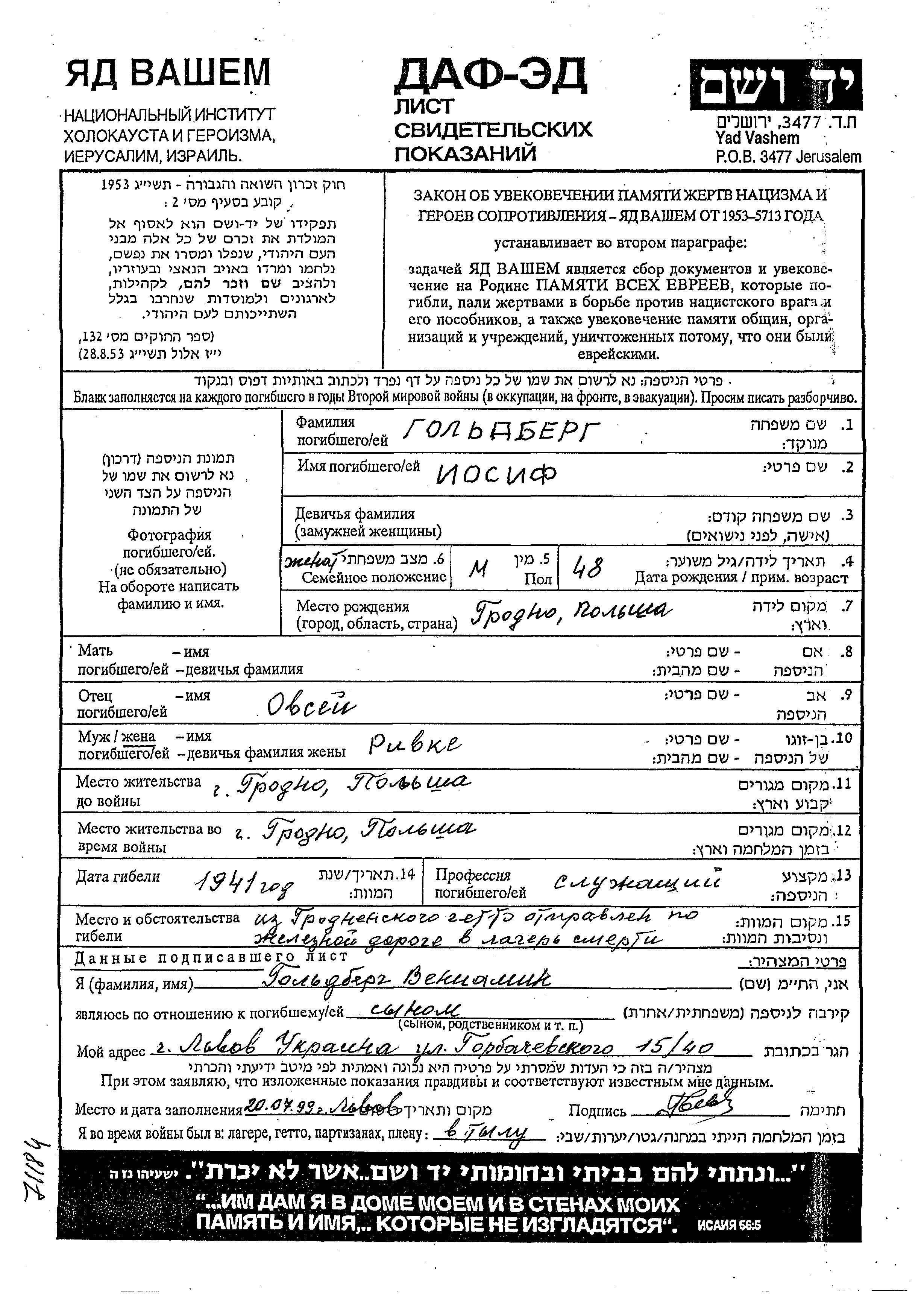 Iosif Goldberg wurde in Grodno, Polen geboren. Er war der Sohn von Yehoshua. Er war Angestellte/-r und mit Rivke Verheiratet. Vor dem Zweiten Weltkrieg lebte er in Grodno, Polen. Während des Krieges war er in Grodno, Polen.