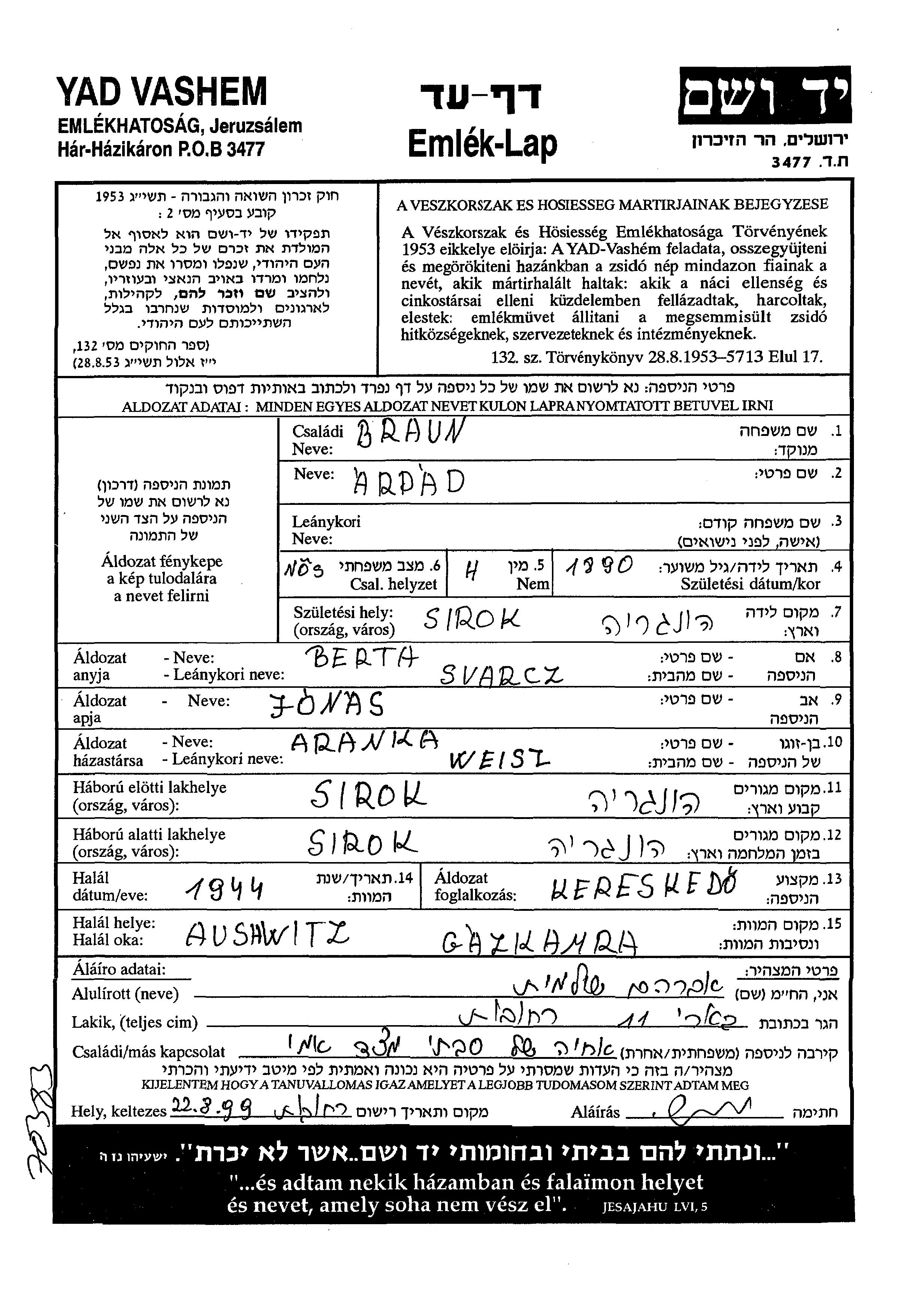 Arpad Braun wurde im Jahr 1890 in Siroka, Tschechoslowakei geboren. Er war der Sohn von Jonas und Berta. Er war Kaufmann/-frau und mit Aranka, geb. Weisz Verheiratet. Vor dem Zweiten Weltkrieg lebte er in Siroka, Tschechoslowakei. Während des Krieges war er in Siroka, Tschechoslowakei.