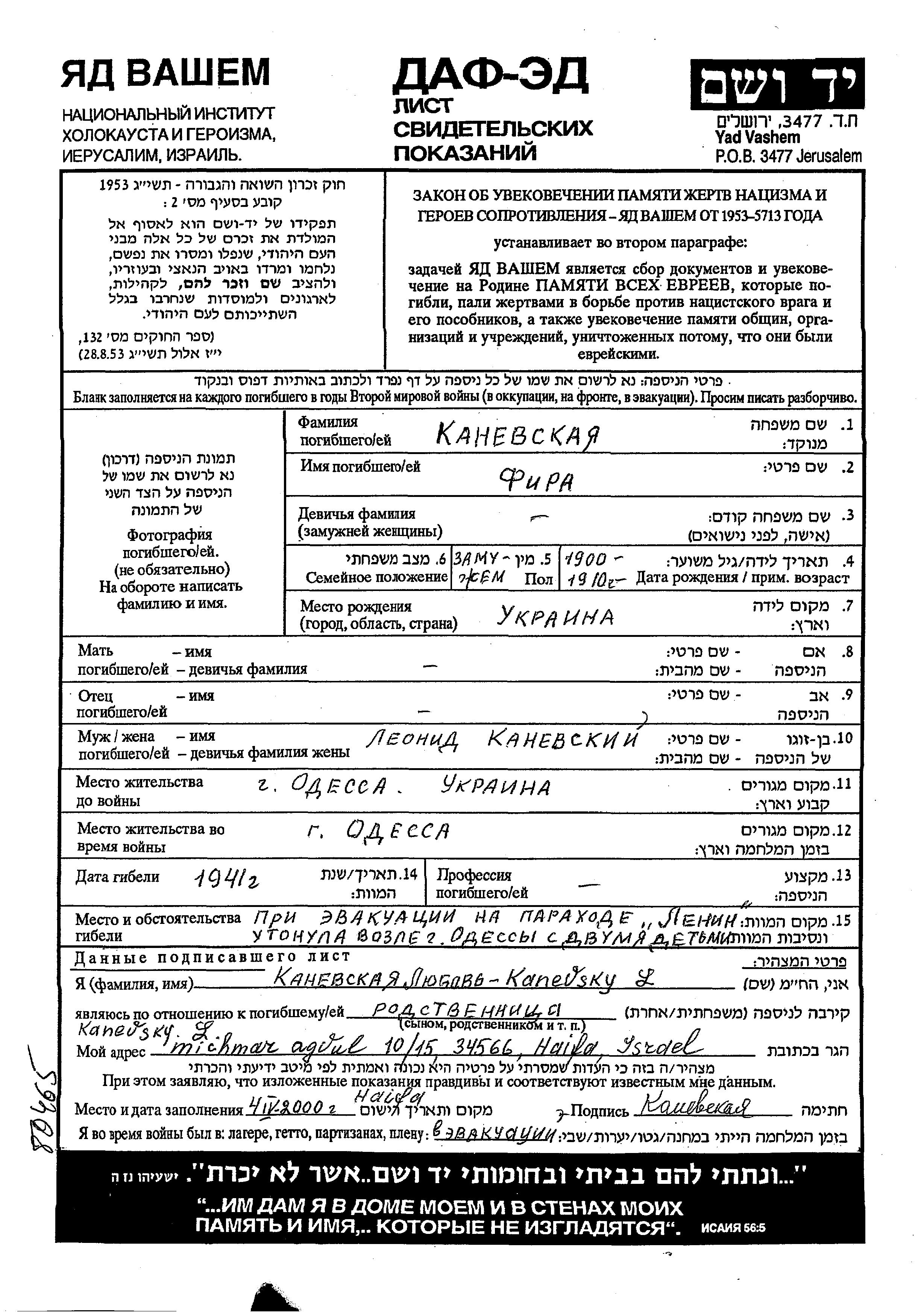 Fira Kanevski wurde im Jahr 1900 in Ukraine (UdSSR) geboren. Vor dem Zweiten Weltkrieg lebte sie in Odessa, Ukraine (UdSSR). Während des Krieges war sie in Odessa, Ukraine (UdSSR).