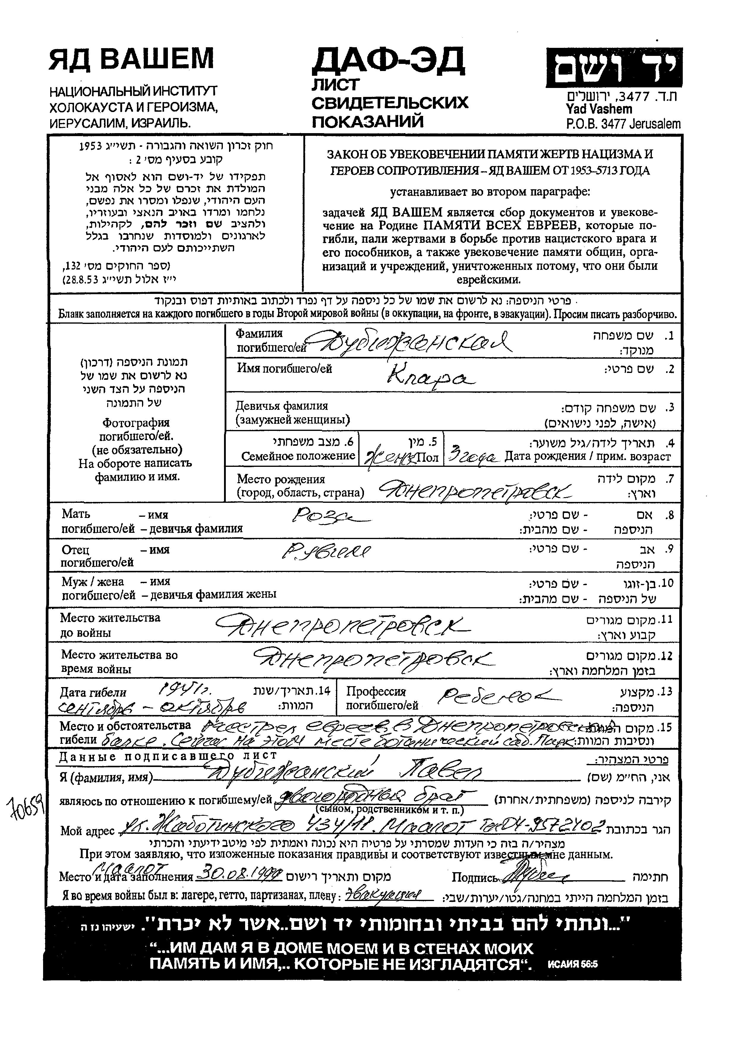Klara Dubizhanski wurde in Dnepropetrovsk, Ukraine (UdSSR) geboren. Sie war die Tochter von Ruvim und Roza. Sie war Kind. Vor dem Zweiten Weltkrieg lebte sie in Dnepropetrovsk, Ukraine (UdSSR). Während des Krieges war sie in Dnepropetrovsk, Ukraine (UdSSR).