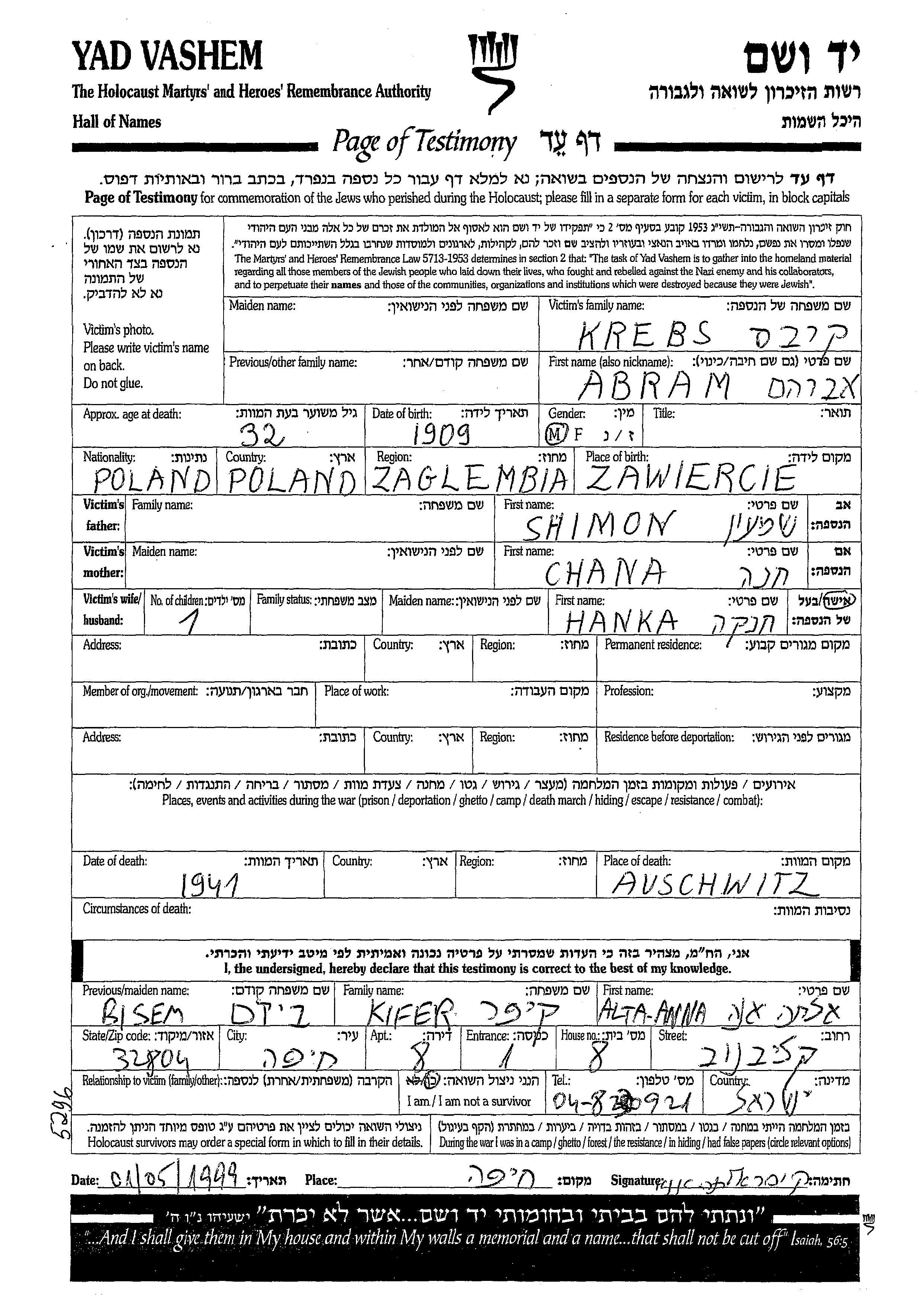 Abram Krebs wurde im Jahr 1909 in Zawiercie, Polen geboren. Er war der Sohn von Shimon und Chana.