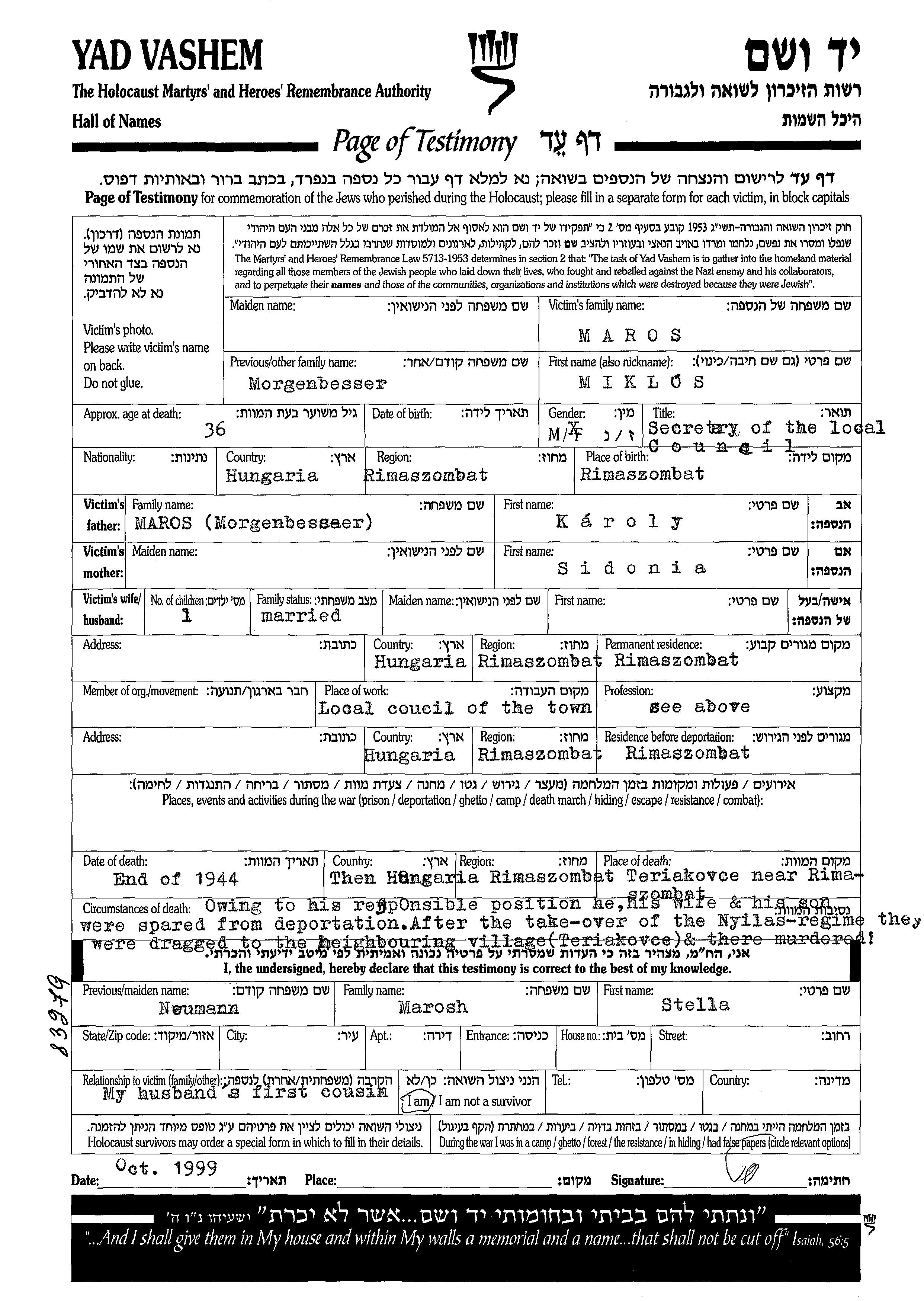 Miklos Maros wurde in Rimaszombat, Tschechoslowakei geboren. Er war der Sohn von Karoly und Sidonia. Er war Städtischer angestellter und Verheiratet. Vor dem Zweiten Weltkrieg lebte er in Rimaszombat, Tschechoslowakei. Während des Krieges war er in Rimaszombat, Tschechoslowakei.