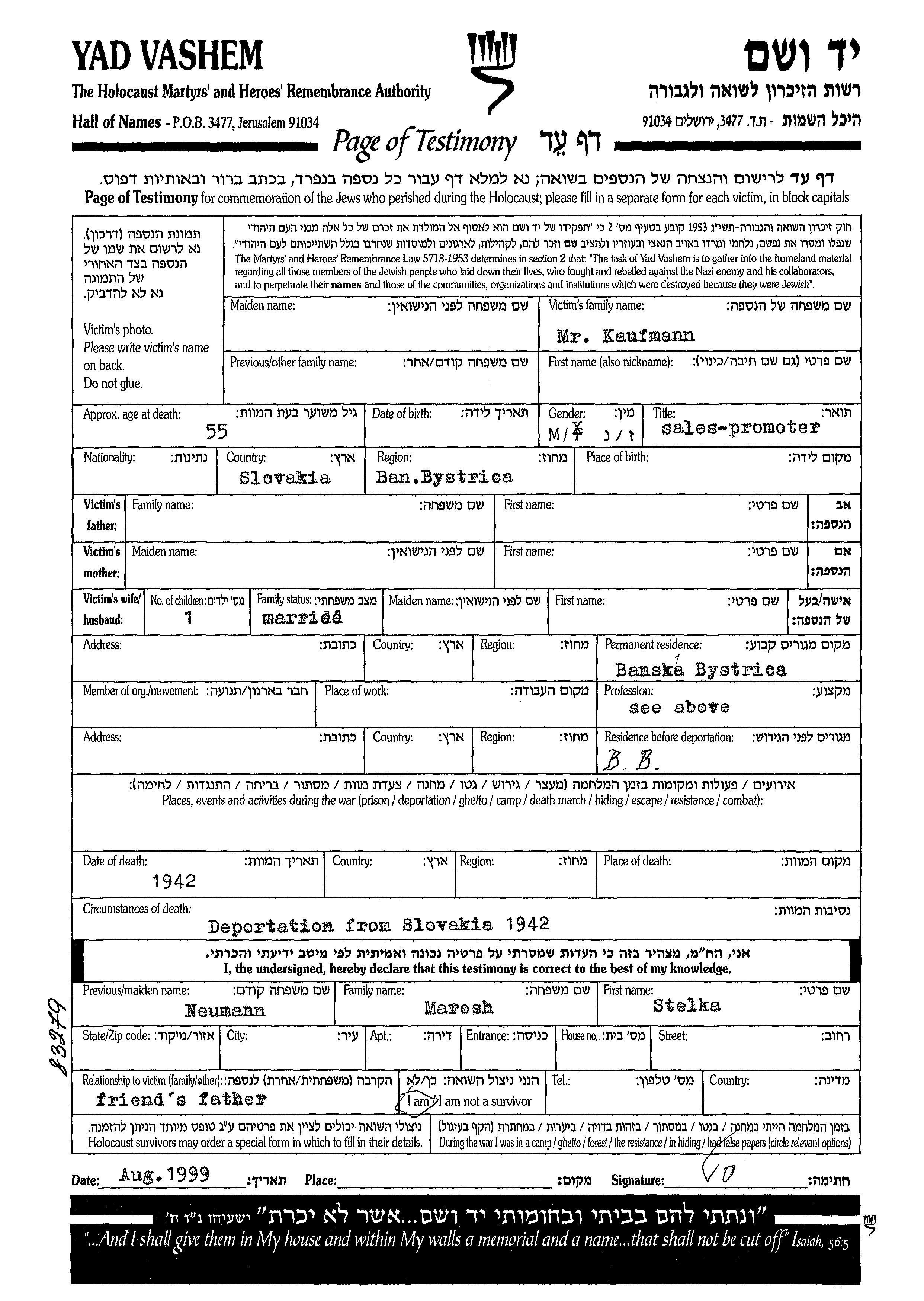 Vorname unbekannt Kaufmann wurde in Banska Bystrica, Tschechoslowakei geboren. Er war Handelsvertreter und Verheiratet. Vor dem Zweiten Weltkrieg lebte er in Banska Bystrica, Tschechoslowakei. Während des Krieges war er in Banska Bystrica, Tschechoslowakei.