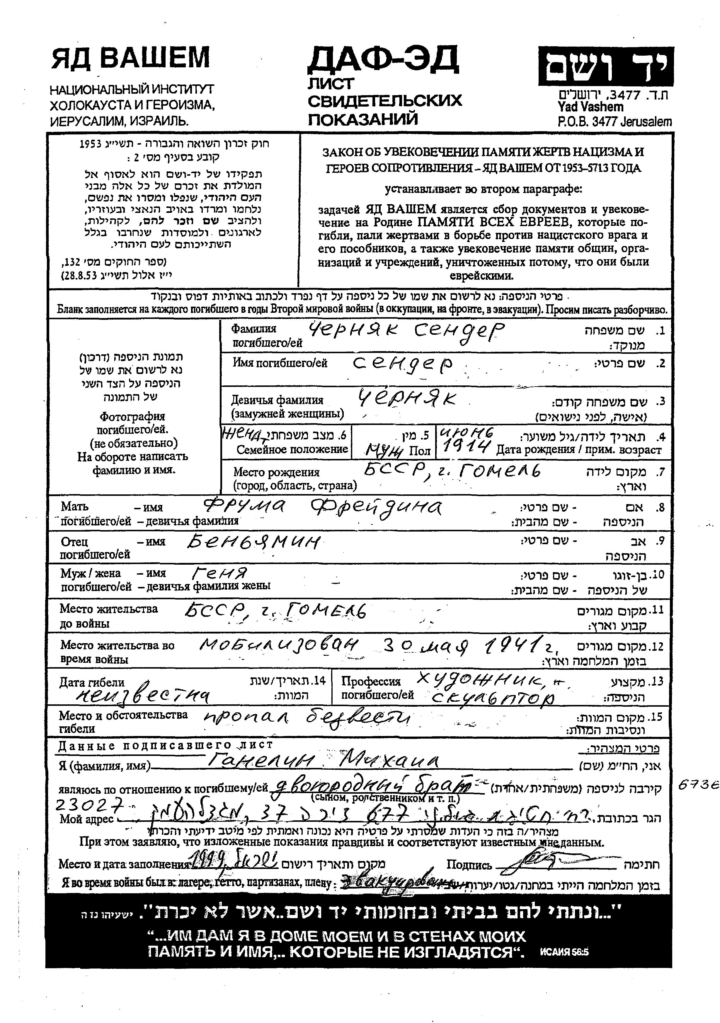 Sender Chernyak Freidin wurde im Jahr 1914 in Gomel, Weißrussland (UdSSR) geboren. Er war der Sohn von Benyamin und Fruma. Er war Kunstmaler/-in und mit Genya Verheiratet. Vor dem Zweiten Weltkrieg lebte er in Gomel, Weißrussland (UdSSR). Während des Krieges war er in die Sowjetischen Streitkräfte.