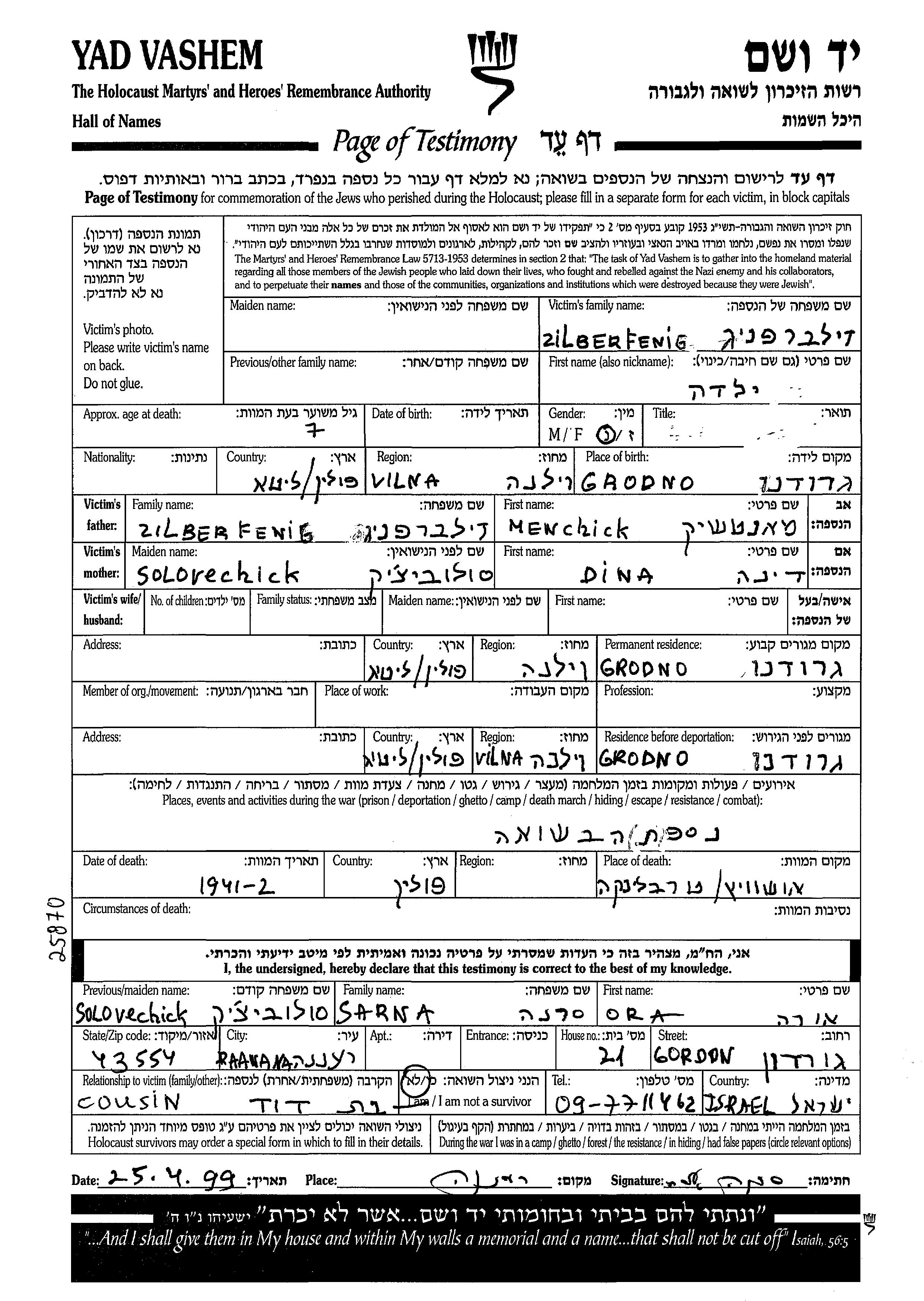 Zilberfenig Vorname unbekannt Grodno, Polen Gedenkblatt