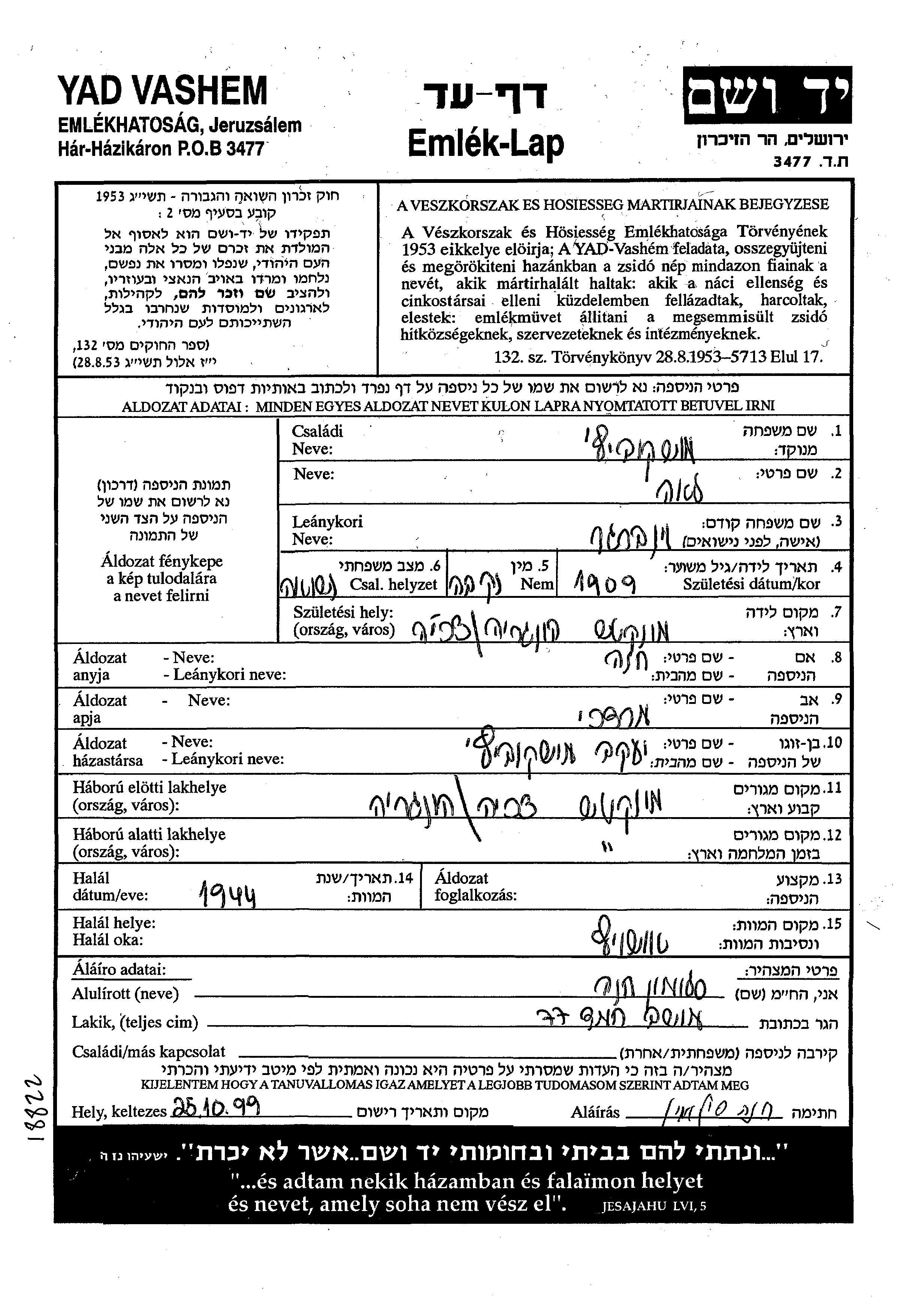 Moshkovitz Lea 1909 Munkac, Tschechoslowakei Gedenkblatt