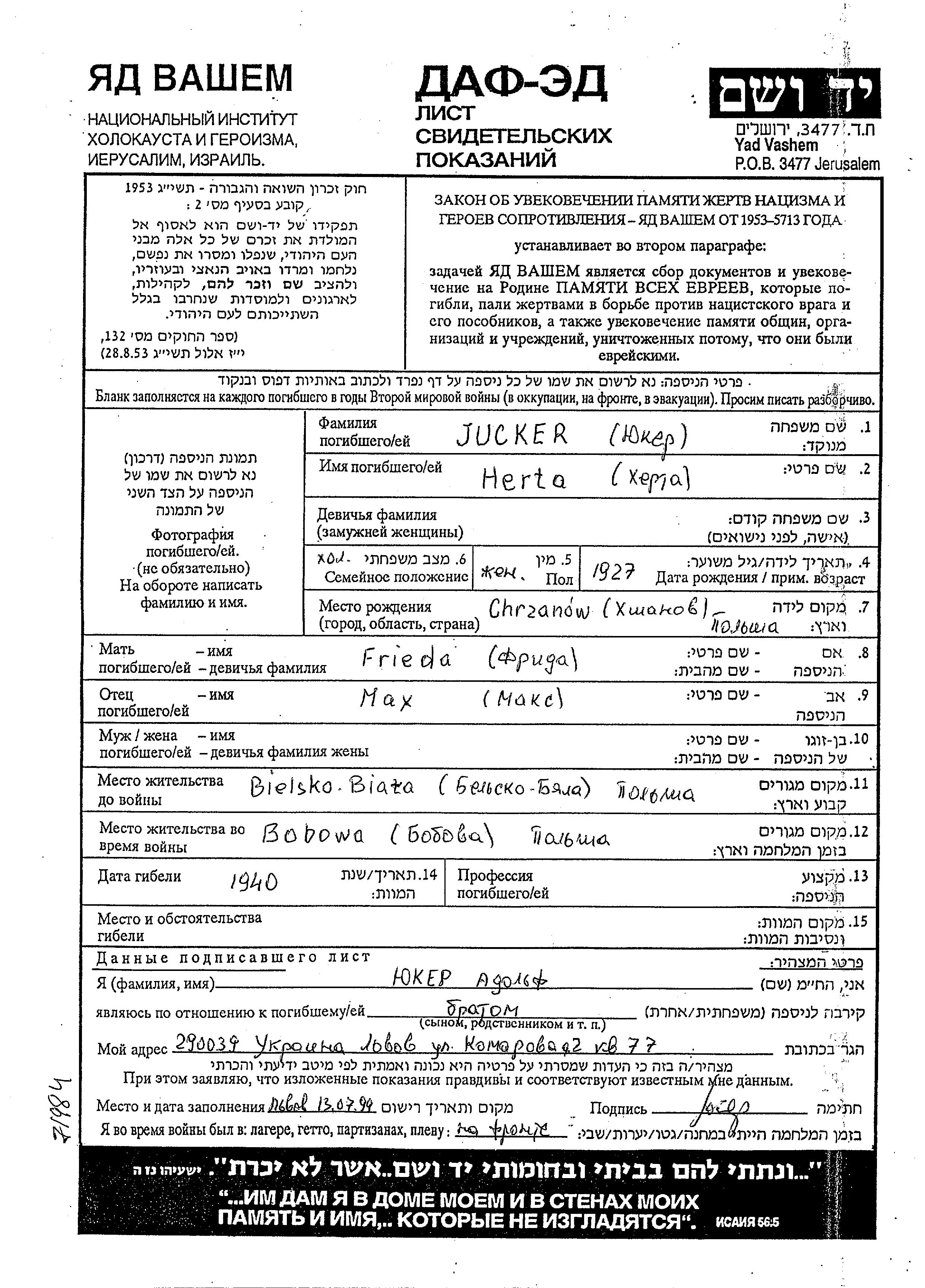 Herta Jucker wurde im Jahr 1927 in Chrzanow, Polen geboren. Sie war die Tochter von Max und Frieda. Sie war Ledig. Vor dem Zweiten Weltkrieg lebte sie in Bielsko Biala, Polen. Während des Krieges war sie in Bobowa, Polen.