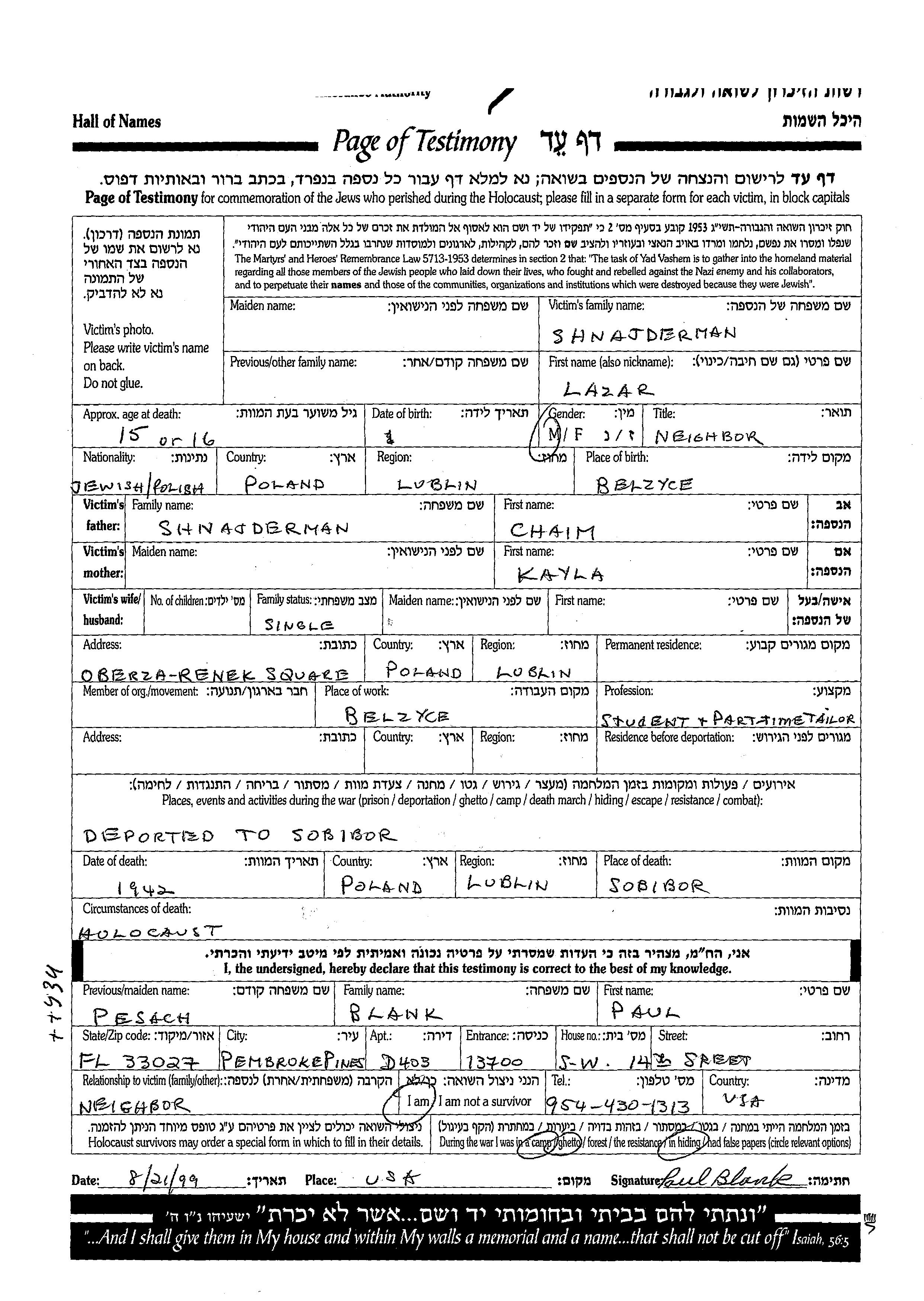 Lazar Shnajderman wurde in Belzyce, Polen geboren. Er war der Sohn von Chaim und Kayla. Er war Student und Ledig. Vor dem Zweiten Weltkrieg lebte er in Lublin, Polen.