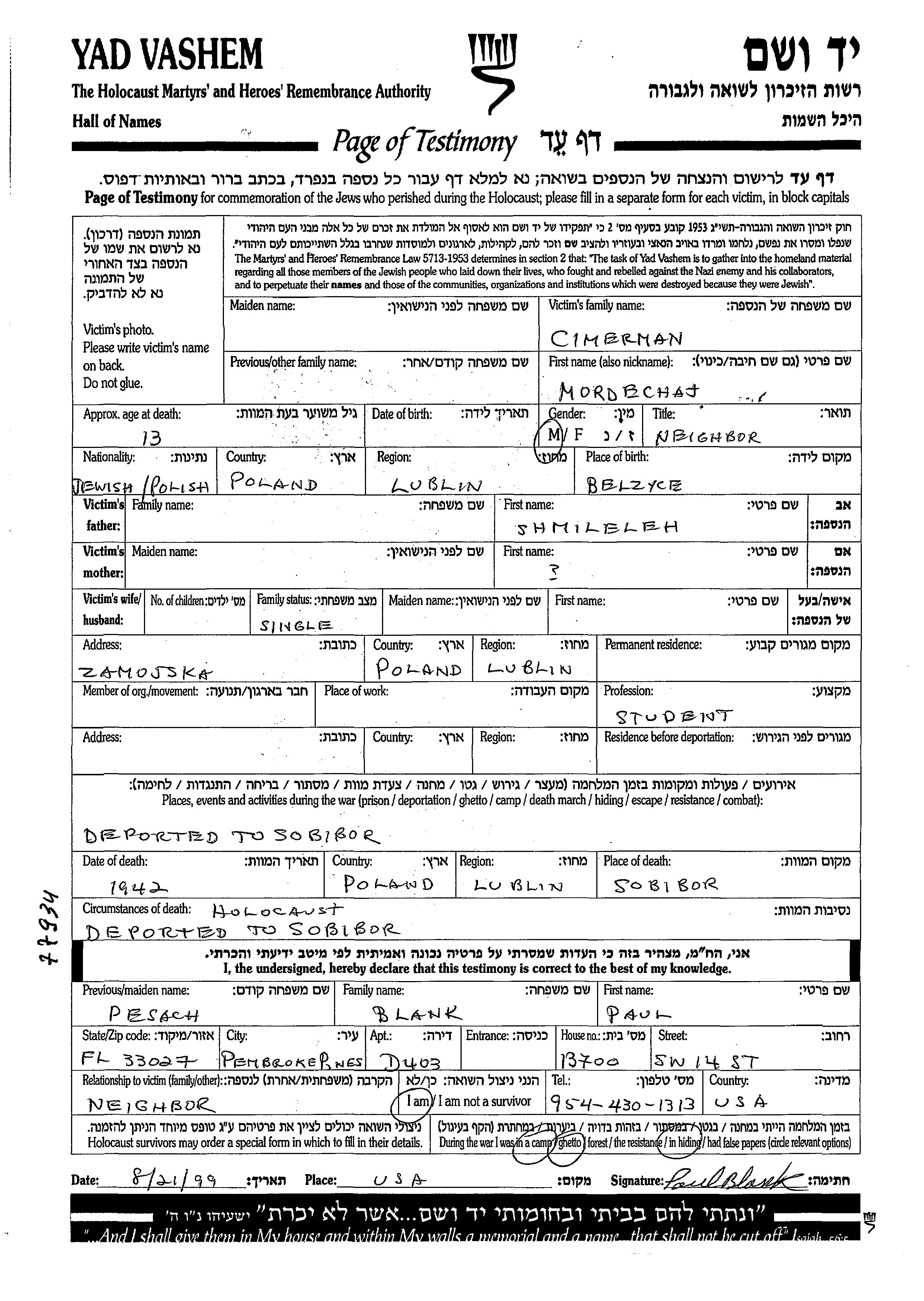 Mordechaj Cimerman wurde in Belzyce, Polen geboren. Er war der Sohn von Shmileleh. Er war Student und Ledig. Vor dem Zweiten Weltkrieg lebte er in Lublin, Polen.