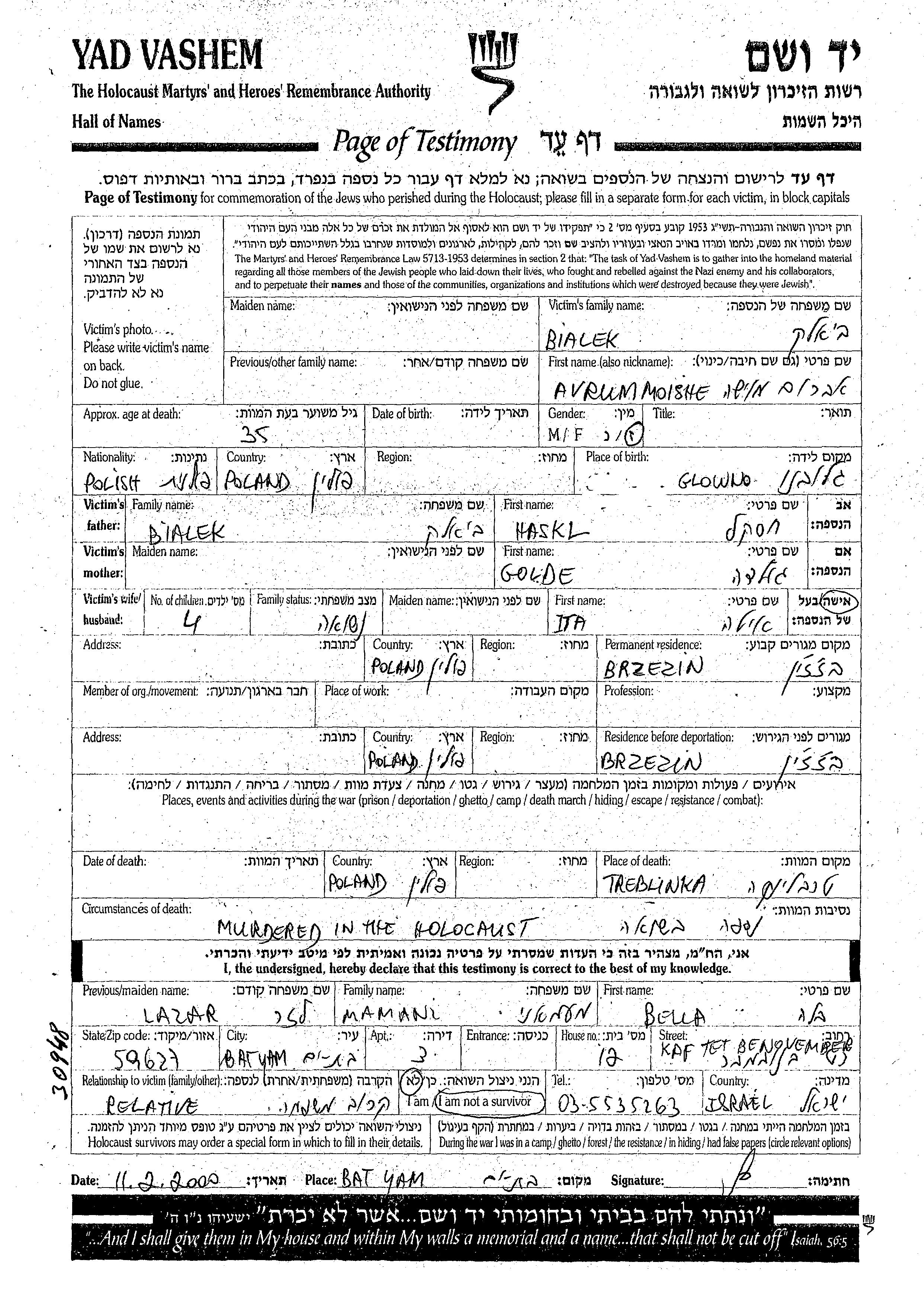 Avrum Moishe Bialek wurde in Glowno, Polen geboren. Er war der Sohn von Haskl und Golda. Er war mit Ita Verheiratet. Vor dem Zweiten Weltkrieg lebte er in Brzezin, Polen. Während des Krieges war er in Brzezin, Polen.