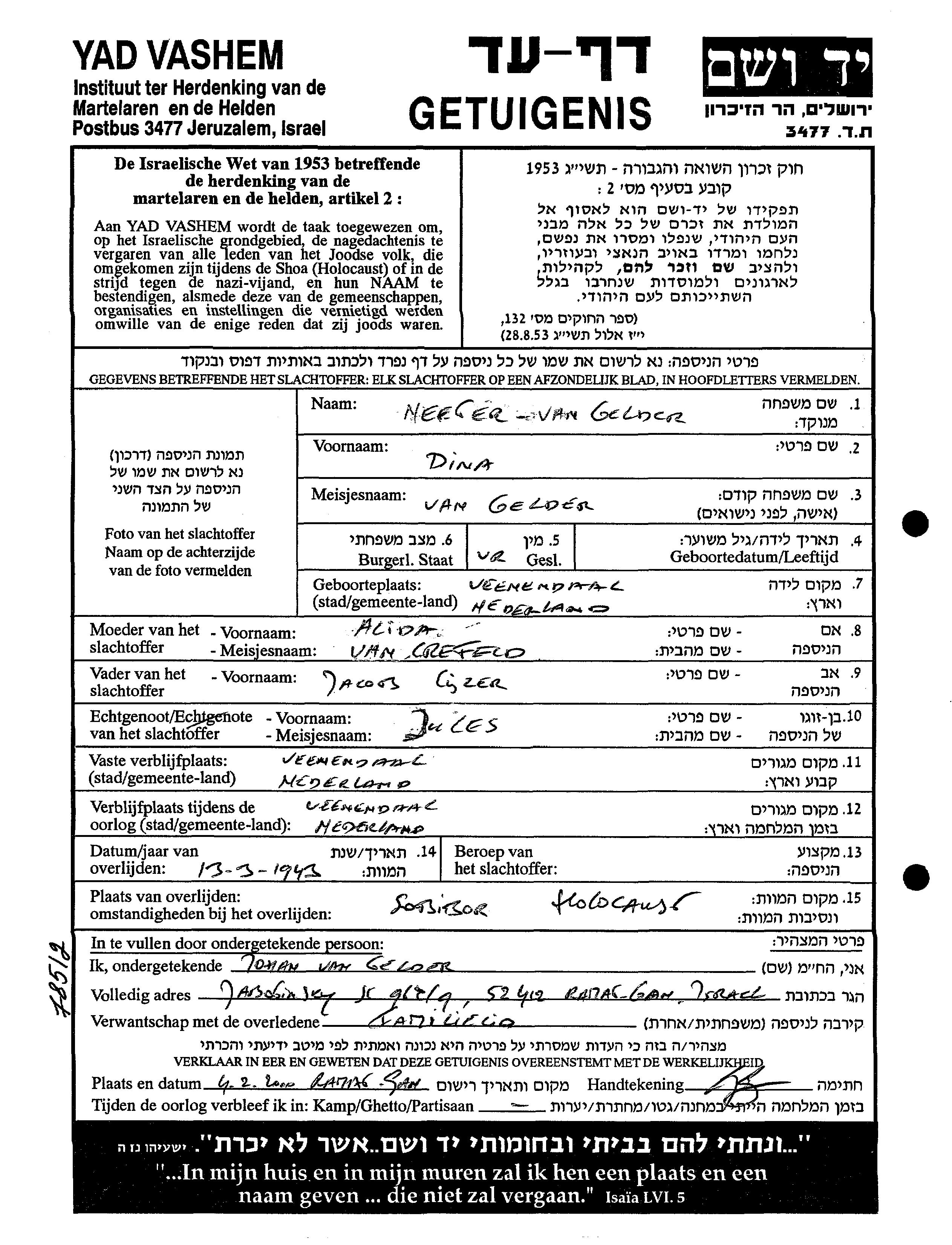 Dina Neeger, geb. Gelder van wurde in Veenendaal, Niederlande geboren. Sie war die Tochter von Jacob Eliezer und Alida. Vor dem Zweiten Weltkrieg lebte sie in Veenendaal, Niederlande. Während des Krieges war sie in Veenendaal, Niederlande.