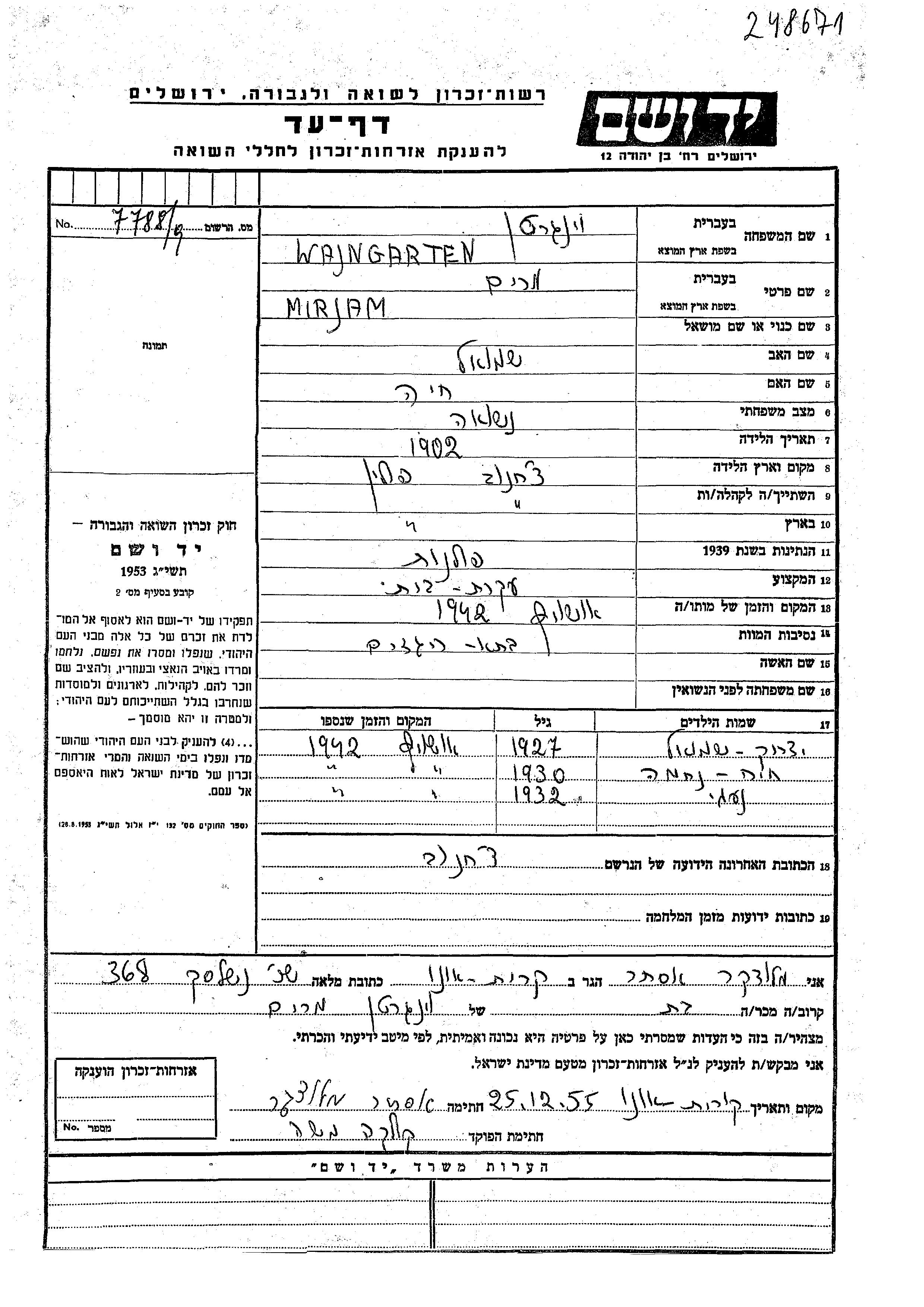 Wajngarten Mirjam 1902 Ciechanow, Polen Gedenkblatt