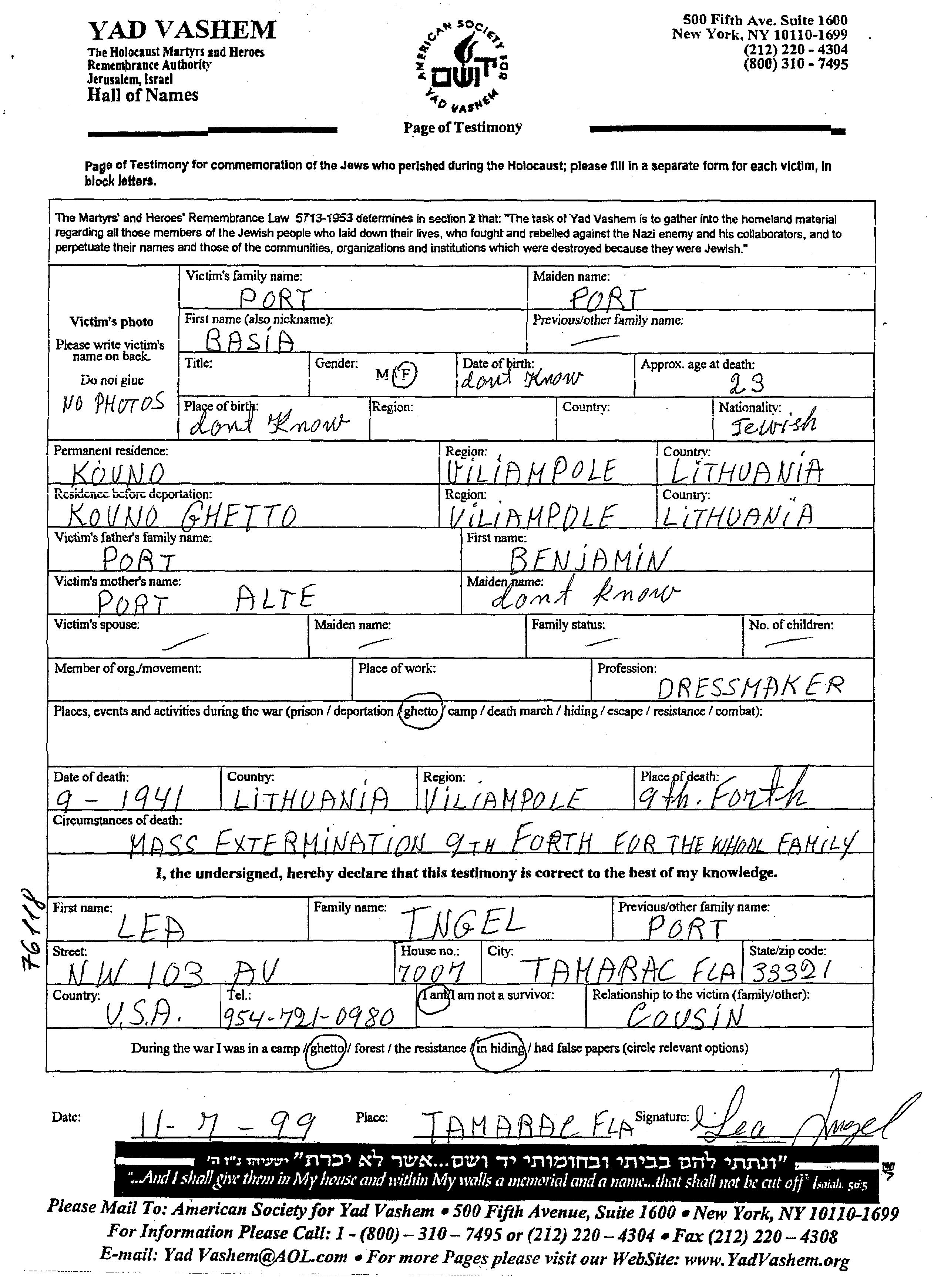 Basia Port Fort wurde Sie war die Tochter von Benjamin und Alte. Sie war Schneiderin. Vor dem Zweiten Weltkrieg lebte sie in Kovno, Litauen. Während des Krieges war sie in Kovno, Litauen.