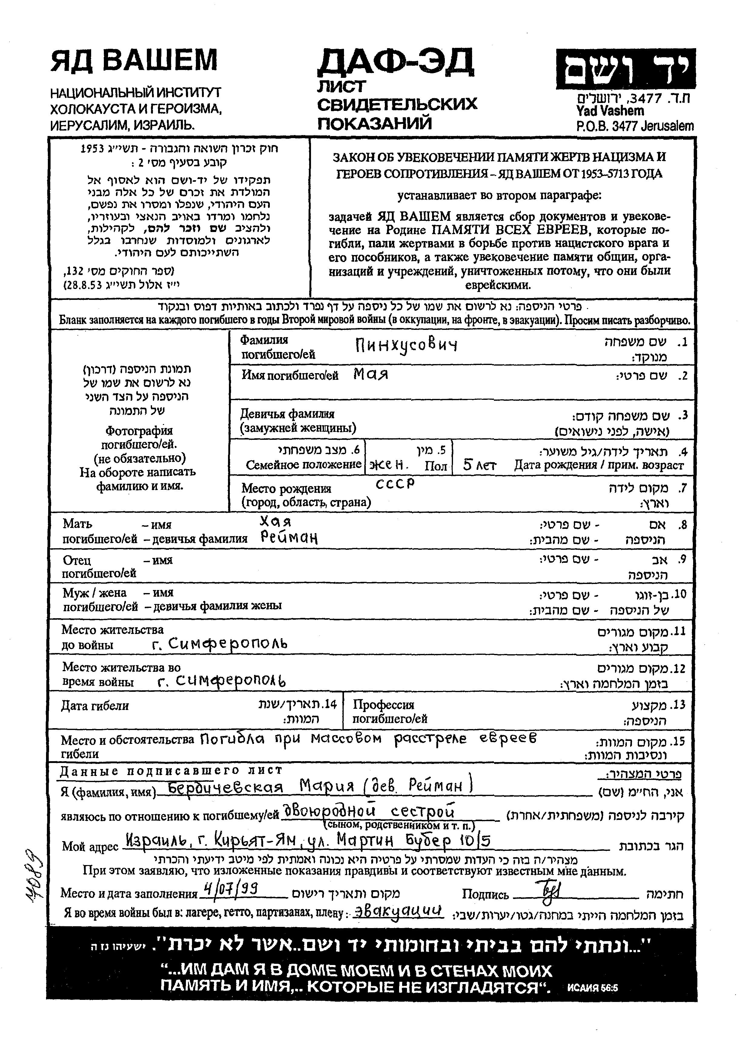 Maya Pinkhusovich wurde in Sowjetunion geboren. Sie war die Tochter von Khaia. Sie war Kind. Vor dem Zweiten Weltkrieg lebte sie in Simferopol, Russland (UdSSR). Während des Krieges war sie in Simferopol, Russland (UdSSR).