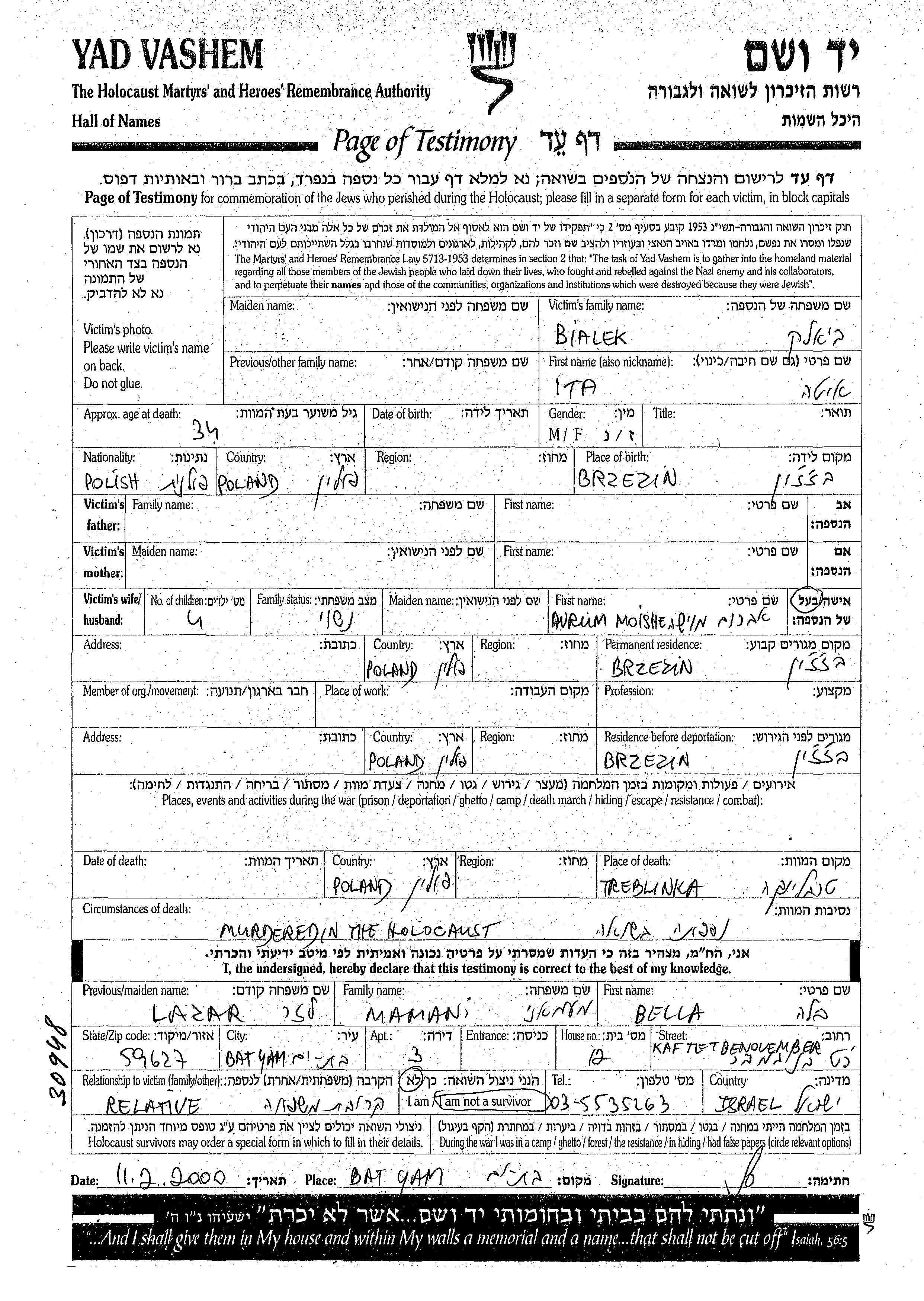 Ita Bialek wurde in Brzezin, Polen geboren. Sie war mit Avrum Moishe Verheiratet. Vor dem Zweiten Weltkrieg lebte sie in Brzezin, Polen. Während des Krieges war sie in Brzezin, Polen.