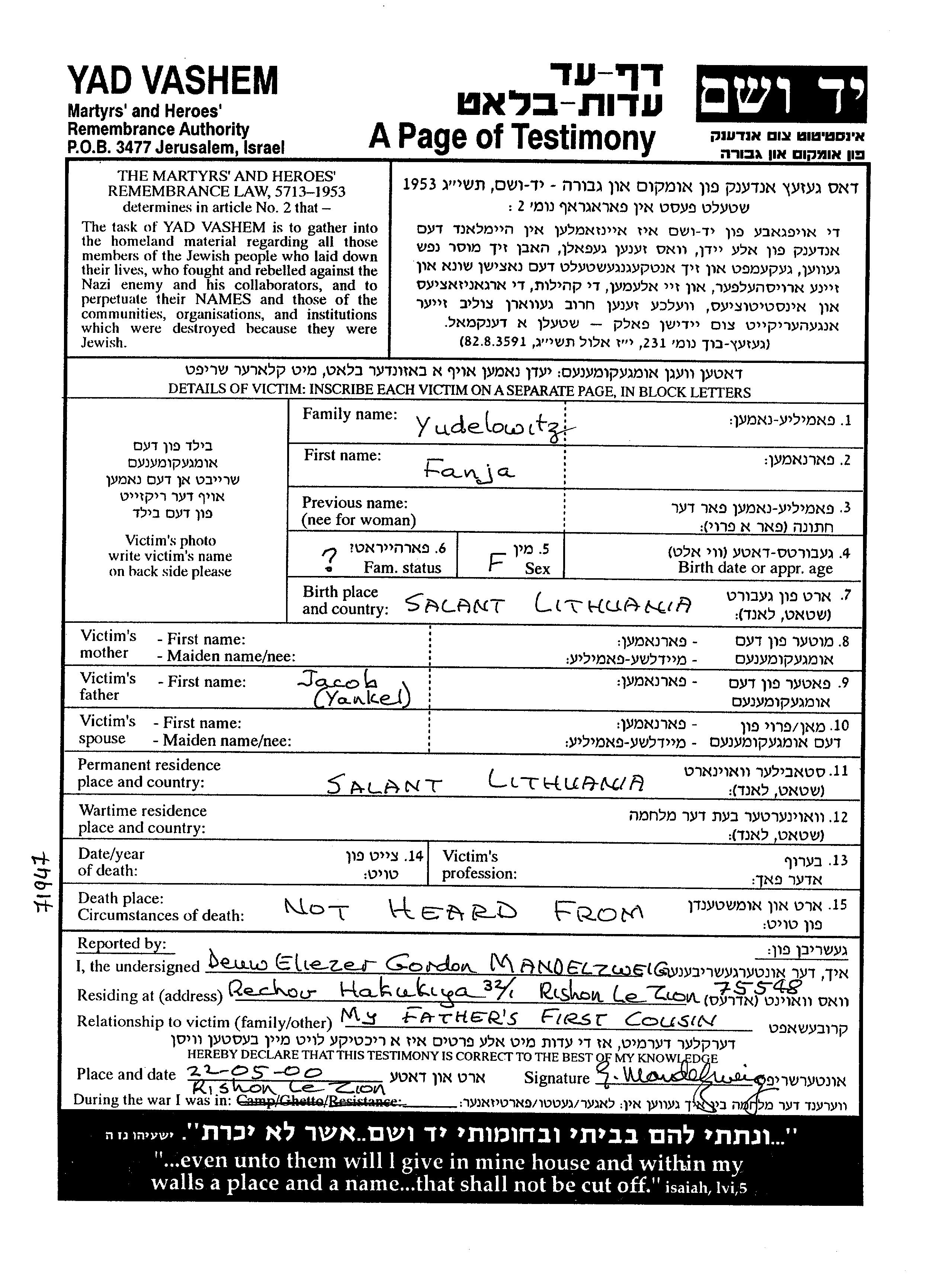 Yudelowitz Fanja Salant, Litauen Gedenkblatt