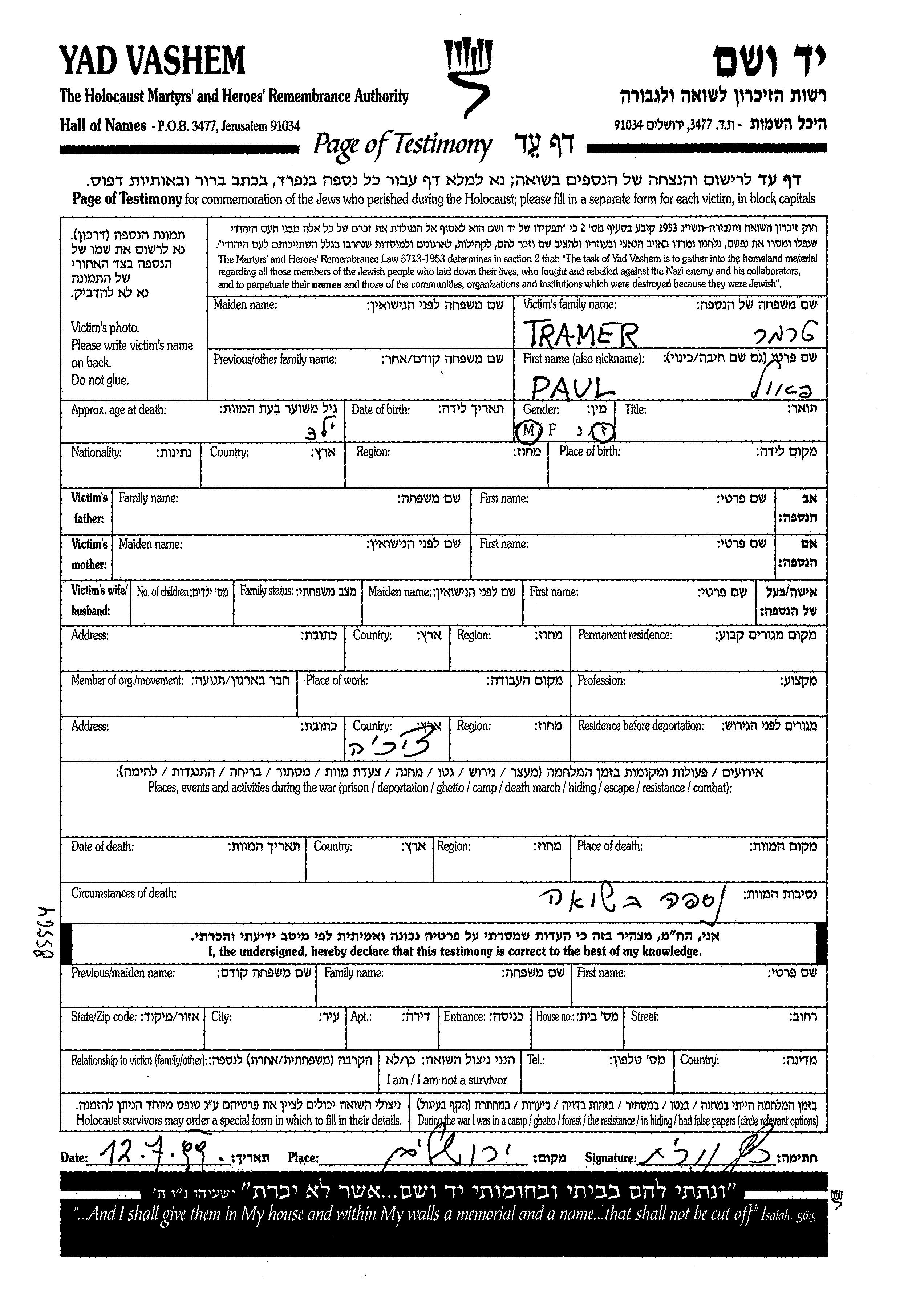 Tramer Paul unbekannter Ort, Gedenkblatt