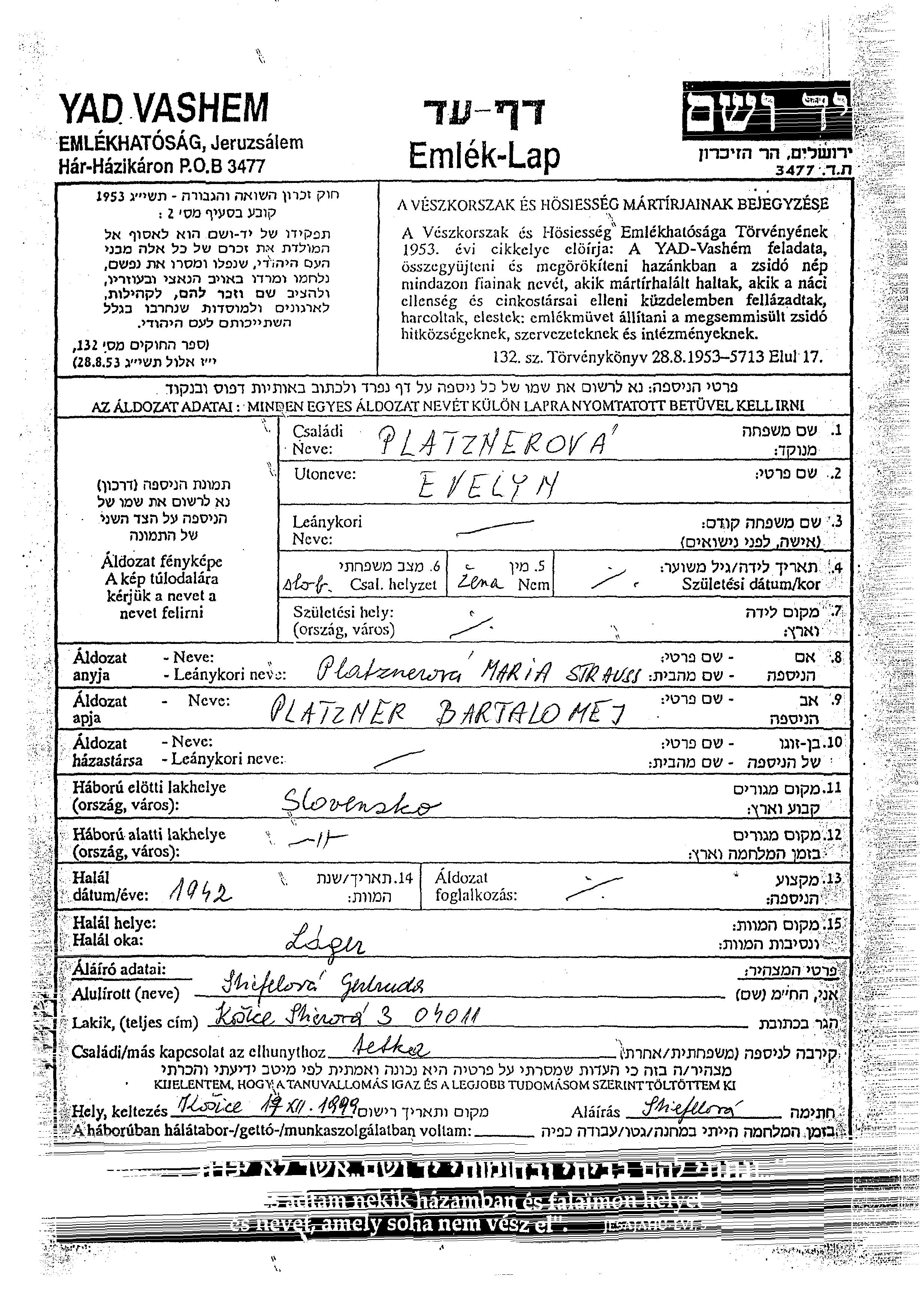 Evelyn Platzner wurde Sie war die Tochter von Bartalomej und Maria. Vor dem Zweiten Weltkrieg lebte sie in Slovakia, Tschechoslowakei. Während des Krieges war sie in Slovakia, Tschechoslowakei.