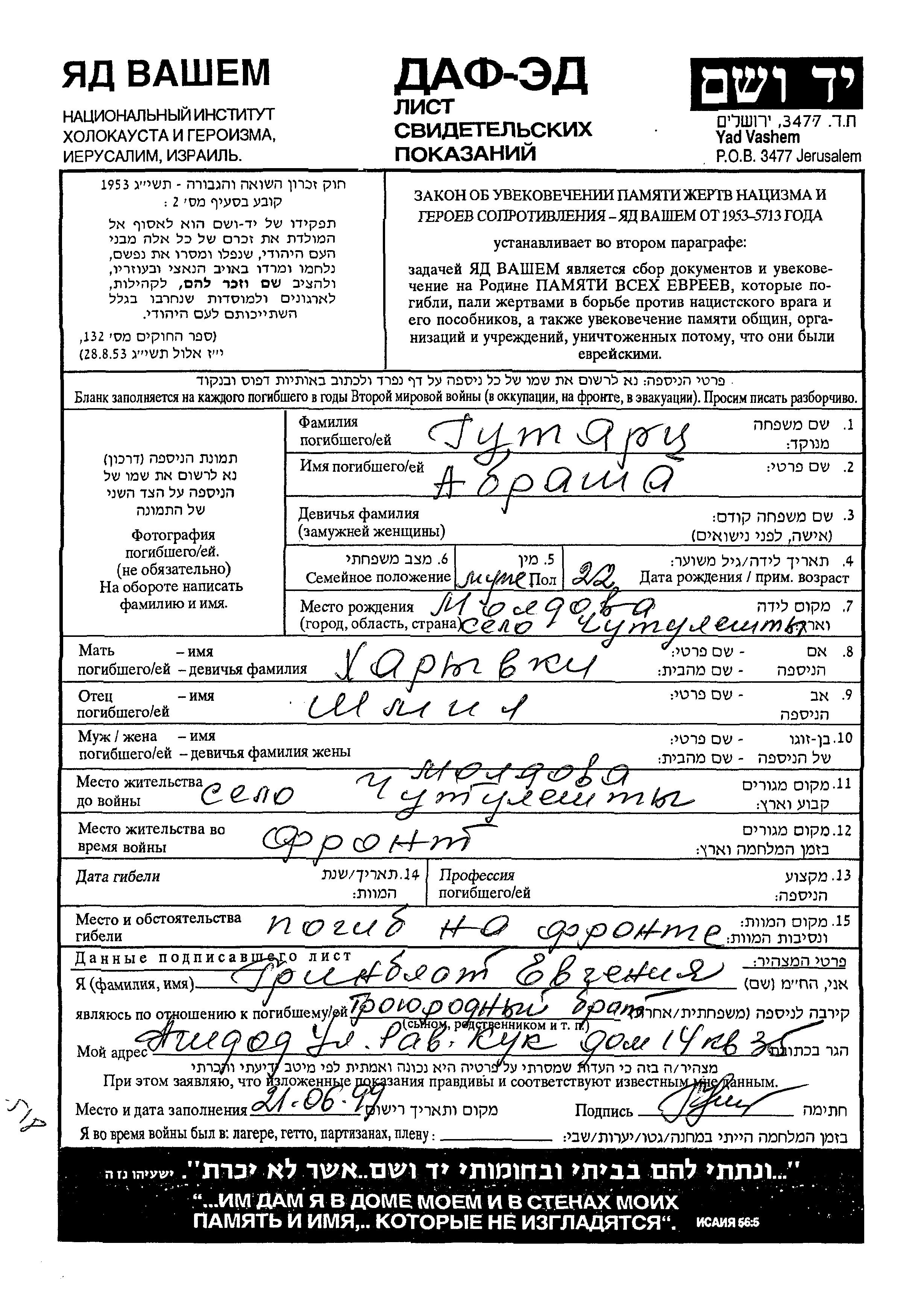 Abrasha im Militärdienst umgekommen. Todesort: die Sowjetischen Streitkräfte.